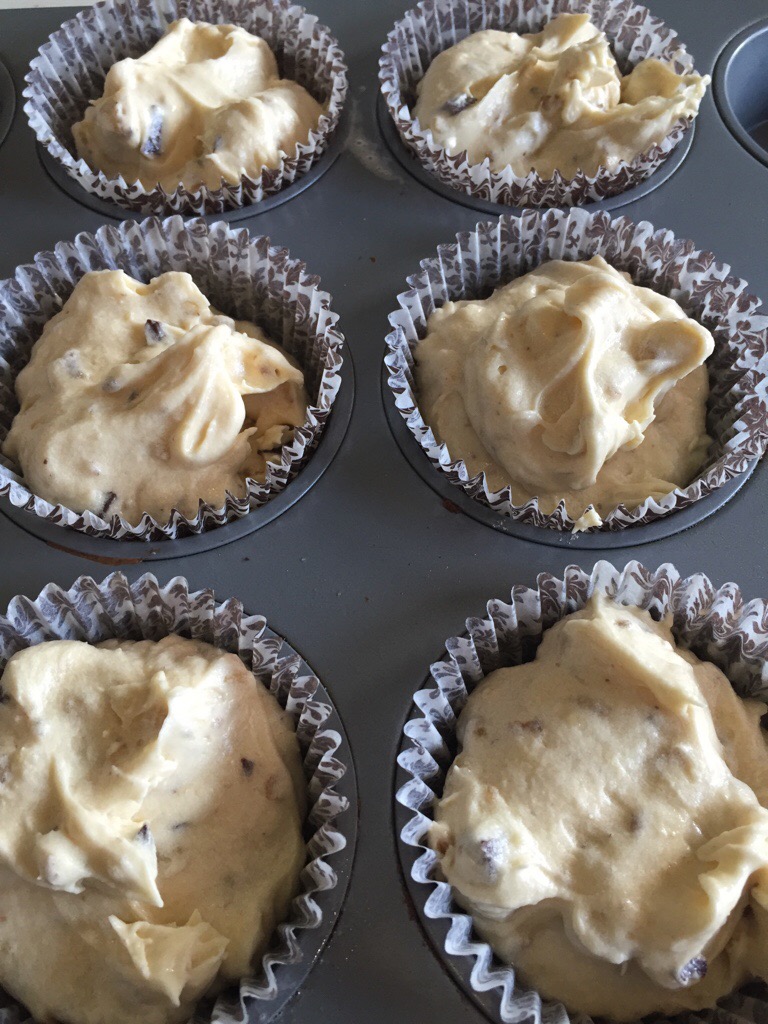 Line a 12 hole muffin pan with cupcake cases, spray with non-stick spray.