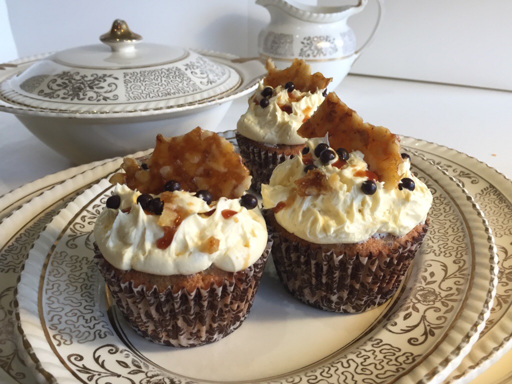 I borrowed this recipe from Brown Eyed Baker, and I really really REALLY want to thank her! These are definitely a new favourite! I confess I swapped out the mixture of brown and white sugar for golden caster sugar, and couldn’t resist adding extra bourbon to the buttercream (greedy, I guess). The walnut brittle was also a flash of inspiration. See how yummy they look.