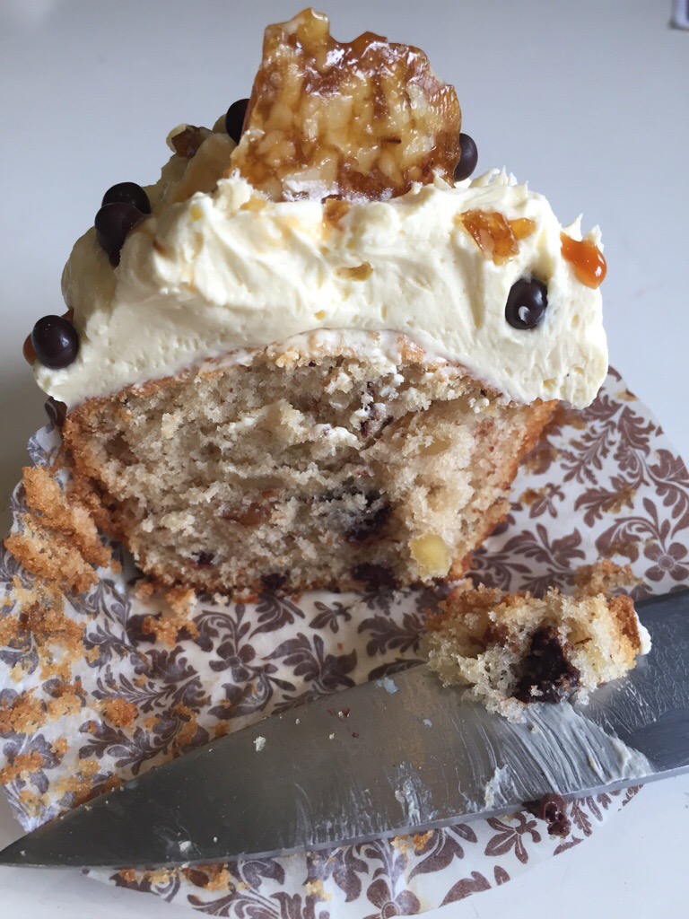 Dollop a big spoonful of frosting on top of each cold cupcake, and spread over with a fork, making nice peaky shapes. Sprinkle with chocolate chips and crushed walnut brittle. Drizzle over some bourbon salted caramel and decorate with a shard of walnut brittle.