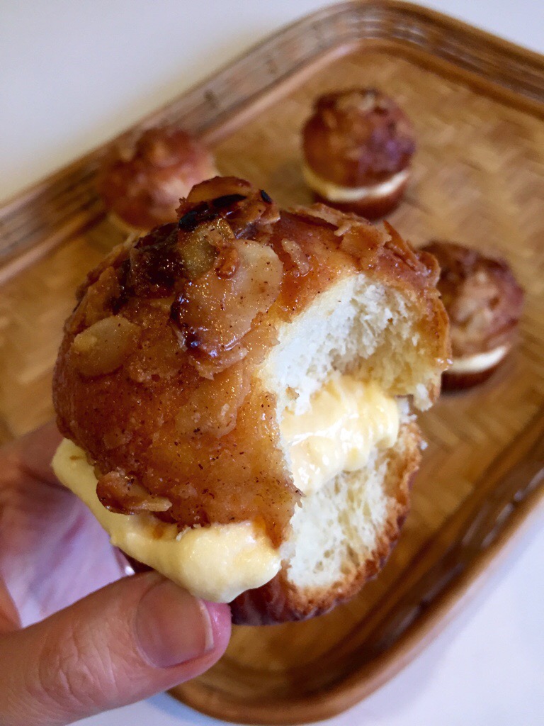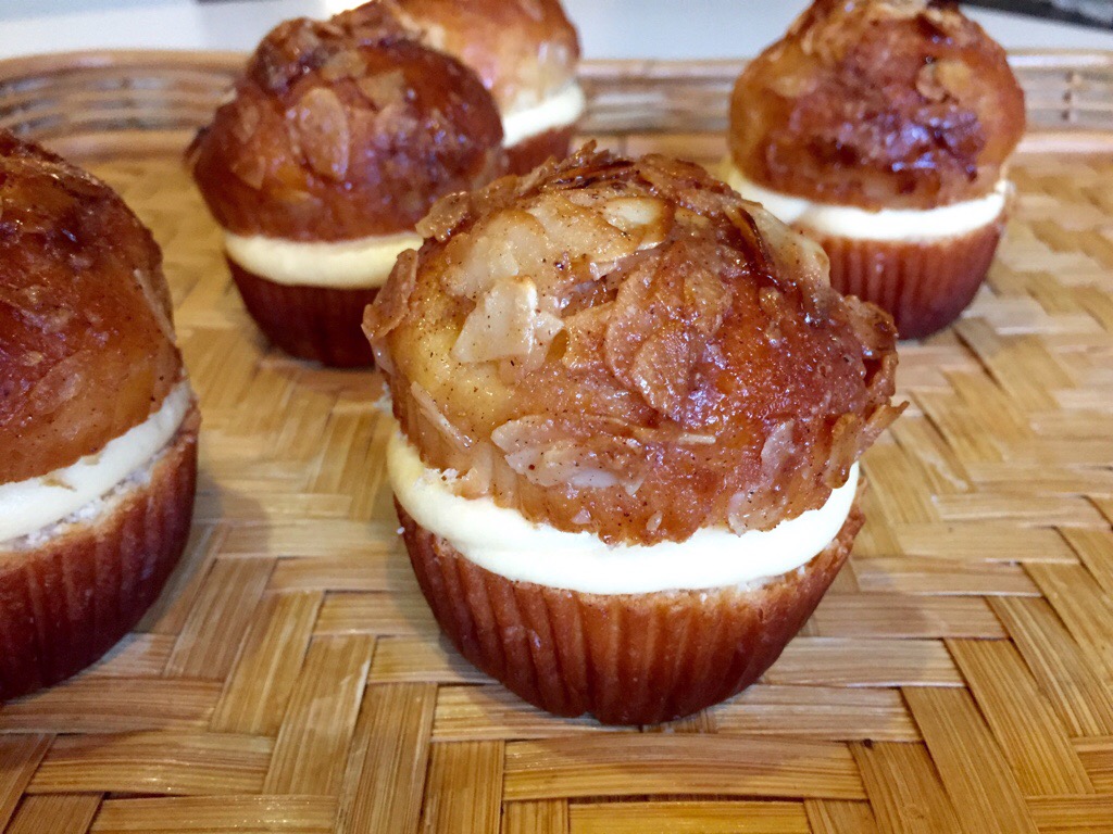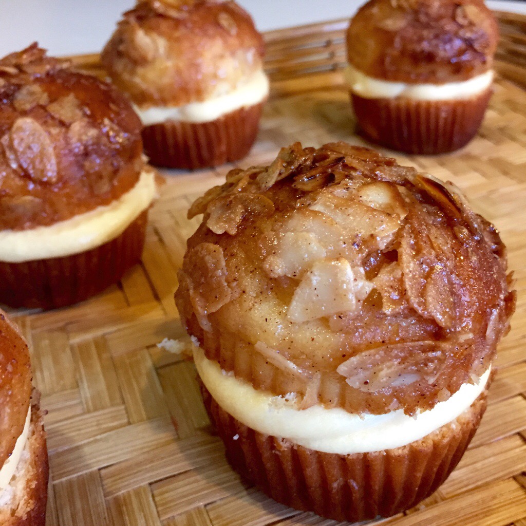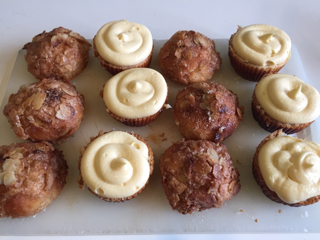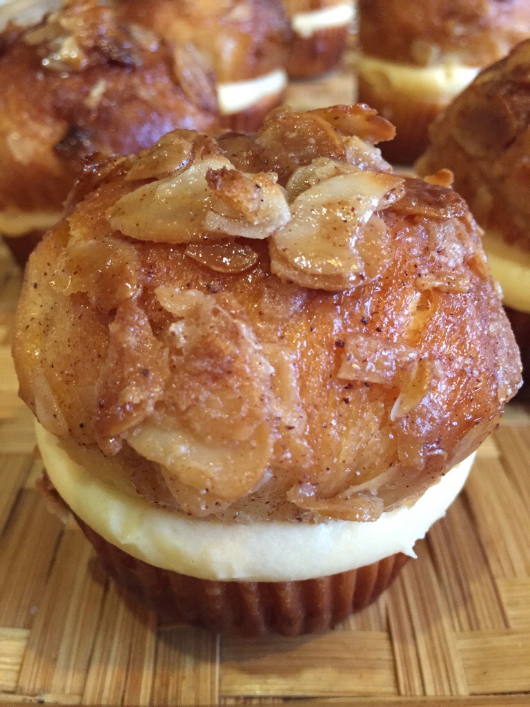 I’ve made it past my second weekend of all cupcakes all the time, and have a bit more of a “coffee” cake type cupcake today – based on the german yeasted cake called Bienestich – or Beesting Cake. If you don’t know it, its well worth seeking out – a sweet brioche type cake, lots of smooth custardy filling, and a crisp toffee almond glaze.