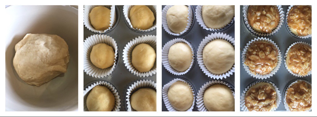 Beesting Cupcake Dough – just made, unrisen and risen dough balls, dough balls coated with glaze