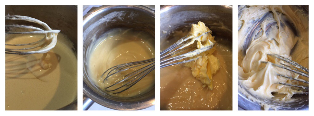 Making the Custard – fluffy egg whites and sugar, the cooked custard, adding the butter, the final mixture