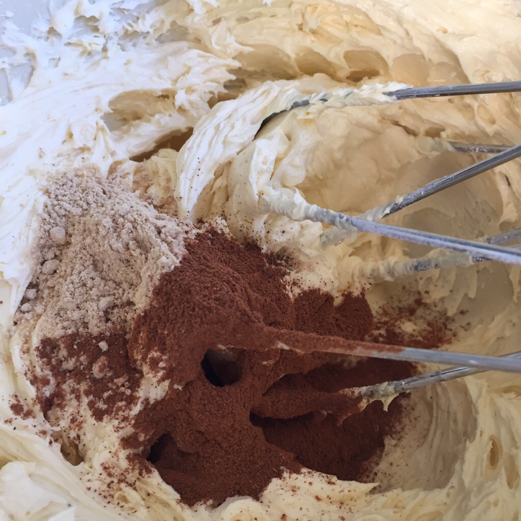 Beat the butter until light and creamy. And then the honey and golden syrup and and beat until combined. Sift over the icing sugar, spices and salt and beat until very light and fluffy.