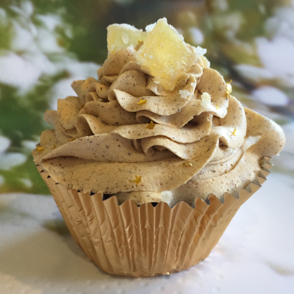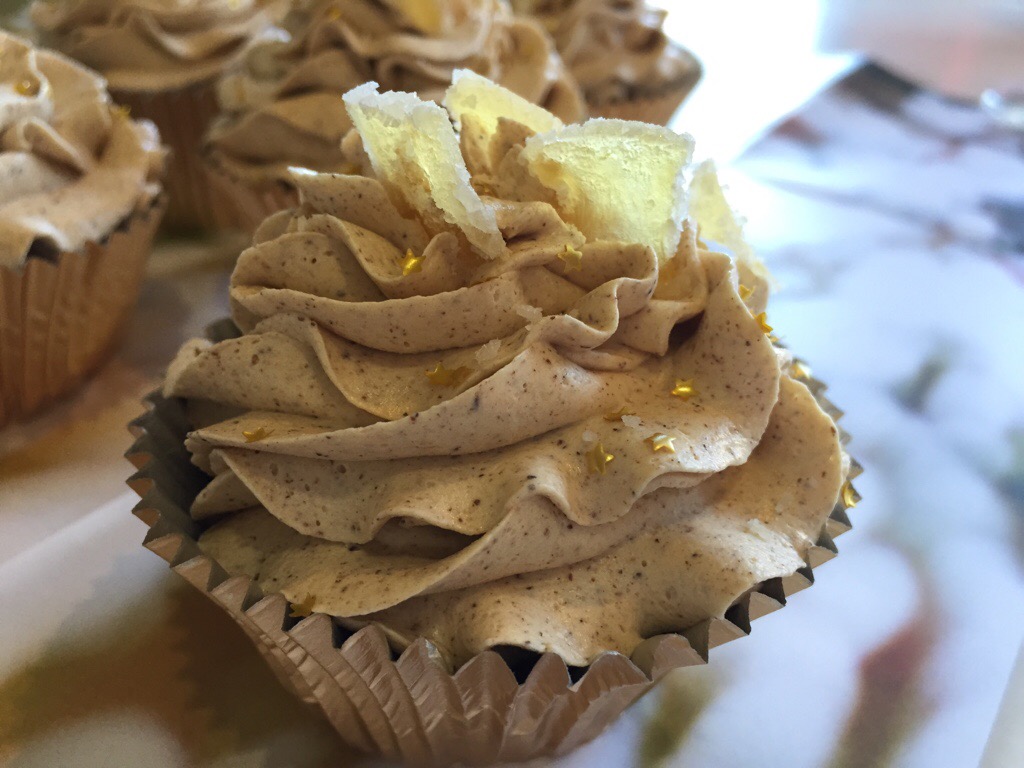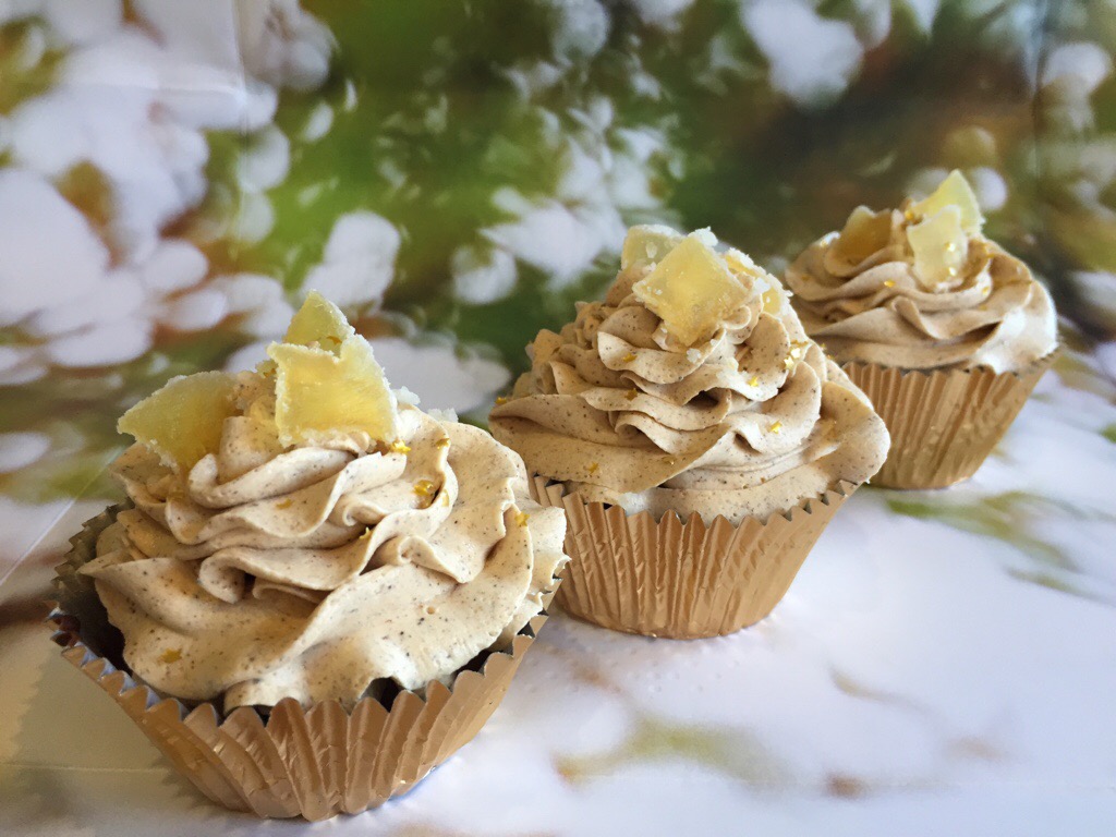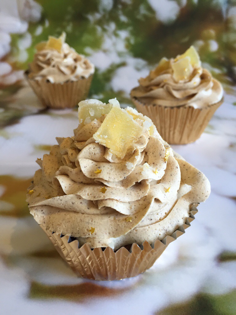 Load the frosting into a piping bag fitted with a star tip and pipe swirls over cold cupcakes. Decorate the top of the cupcakes with fine slivers of crystallised ginger. I also sprinkled some little edible gold stars over the top for a bit of a Christmassy feel.