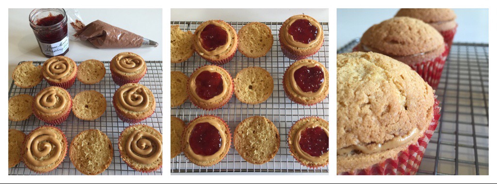 When the cupcakes are cold, cut off the rounded tops with a sharp knife, and line each top up to its cupcake (you’re going to put them back on in a bit!). Heat the peanut butter for a few seconds in the microwave until it reaches a slightly softer consistency, then load it into a piping bag fitted with a 4mm round nozzle. Pipe a spiral of peanut butter on the cut surface of the cupcake, as shown below. Spoon a scant teaspoonful of strawberry jam over the top of the spiral, taking care to leave a ring of peanut butter around the outside, as shown below. Finally, replace the tops of the cupcakes and press down gently until the peanut butter starts to emerge around the cut edge.