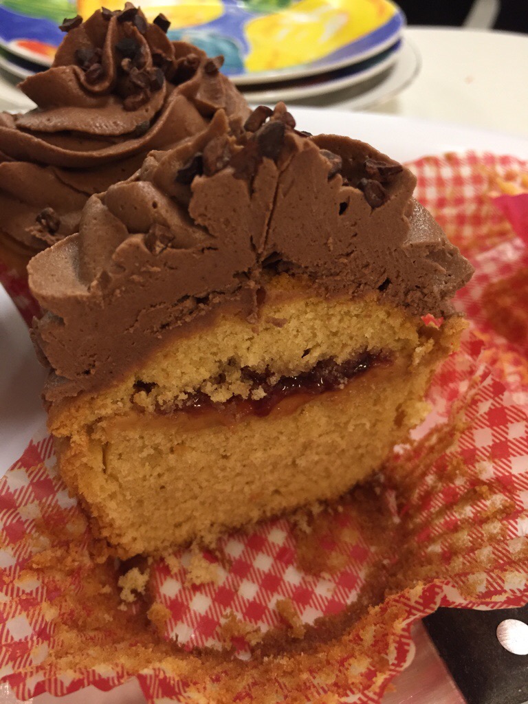 Peanut Butter Cupcakes with PB+J filling and Chocolate PB Frosting