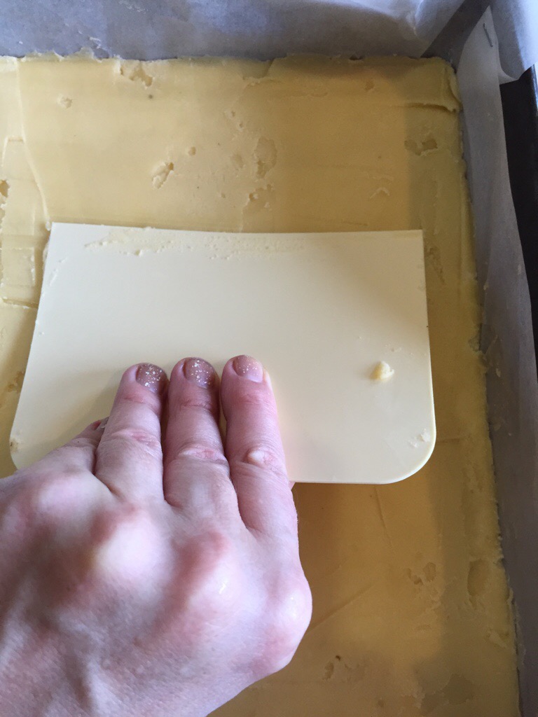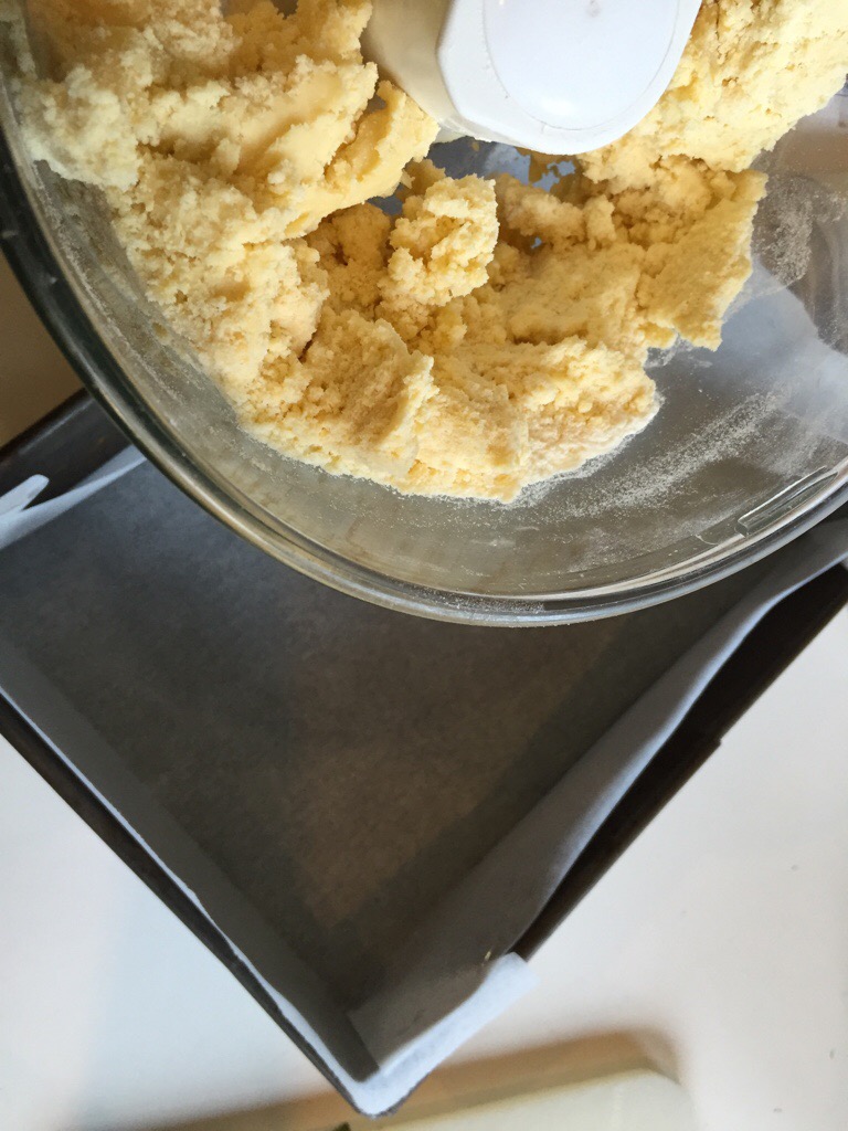 Bake the shortbread base at 210 degrees Celsius for 15 minutes, until golden. Let cool.