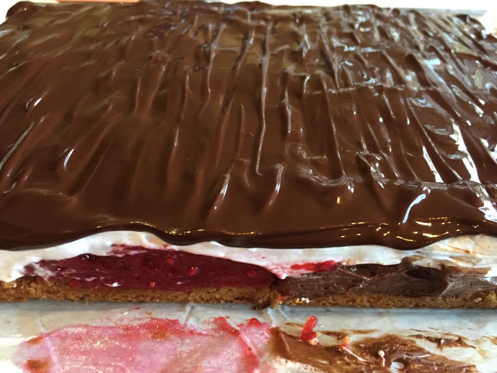 When the marshmallow is done, remove the card holding the raspberry jelly, and spread about 3/4 of a cup of marshmallow into the final quadrant. Then, carefully spread the remaining marshmallow over the entire top of the slice. Refrigerate until set.
