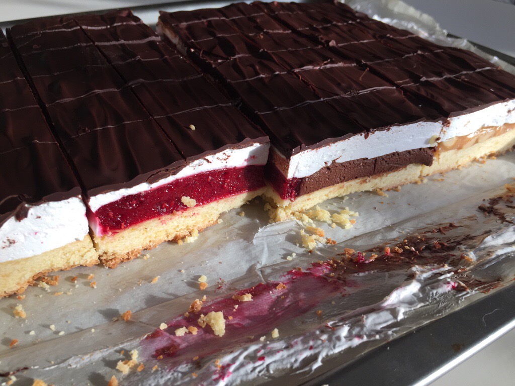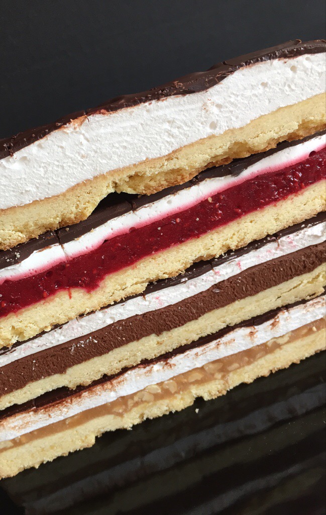 When the raspberry jelly has begun to gel (it will look like thick jam), spread this into the third quadrant, and remove the card between the chocolate and the raspberry. Return the slice to the fridge to let the jelly set completely.