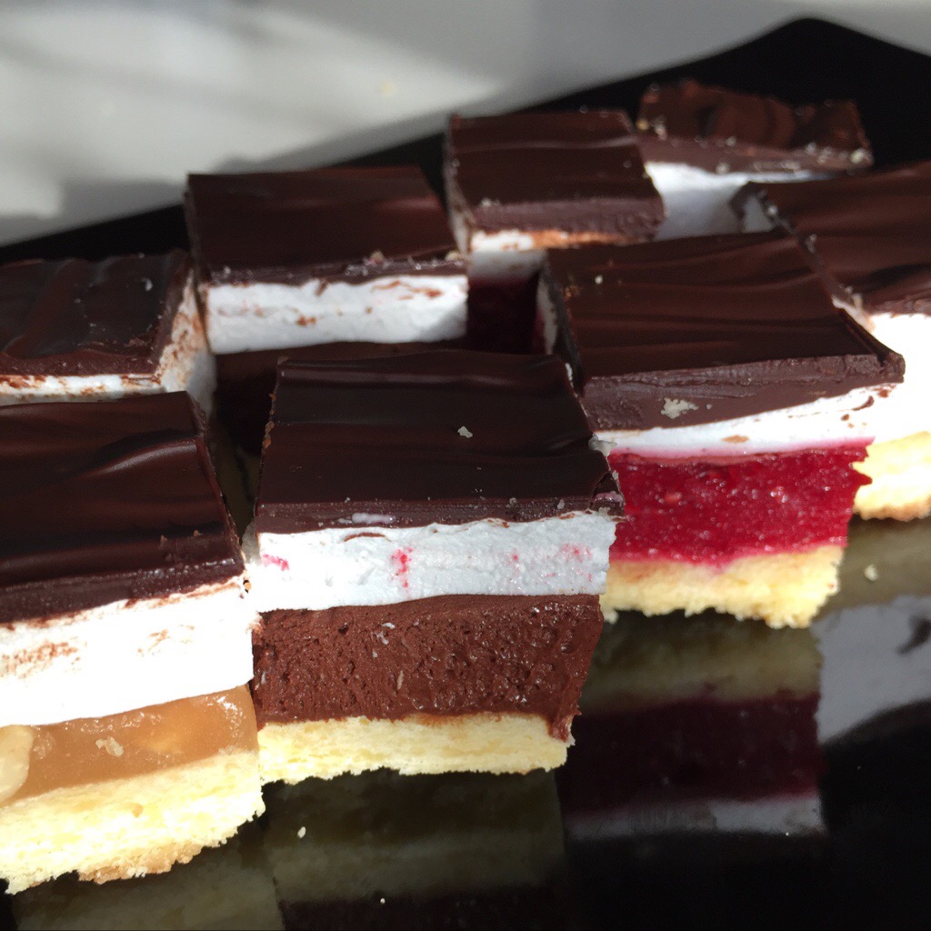 When you have scored all the chocolate, you can use a clean cold knife to cut the slice. If want your marshmallow to stay white and pretty, you need to clean the knife after each cut, especially with the chocolate mousse and raspberry jelly quadrants!