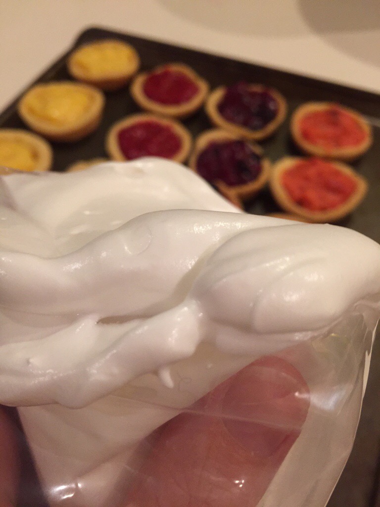 The recipe below makes one 28cm pie, or 20 muffin pan sized mini pies. If you are making the mini pies, just make half the quantity of meringue. If you want to do as I have done and make five mini pies of each flavour, just make one quarter of the filling recipe and one half of the meringue recipe. You will have a little bit more filling than you can use. I ate it!