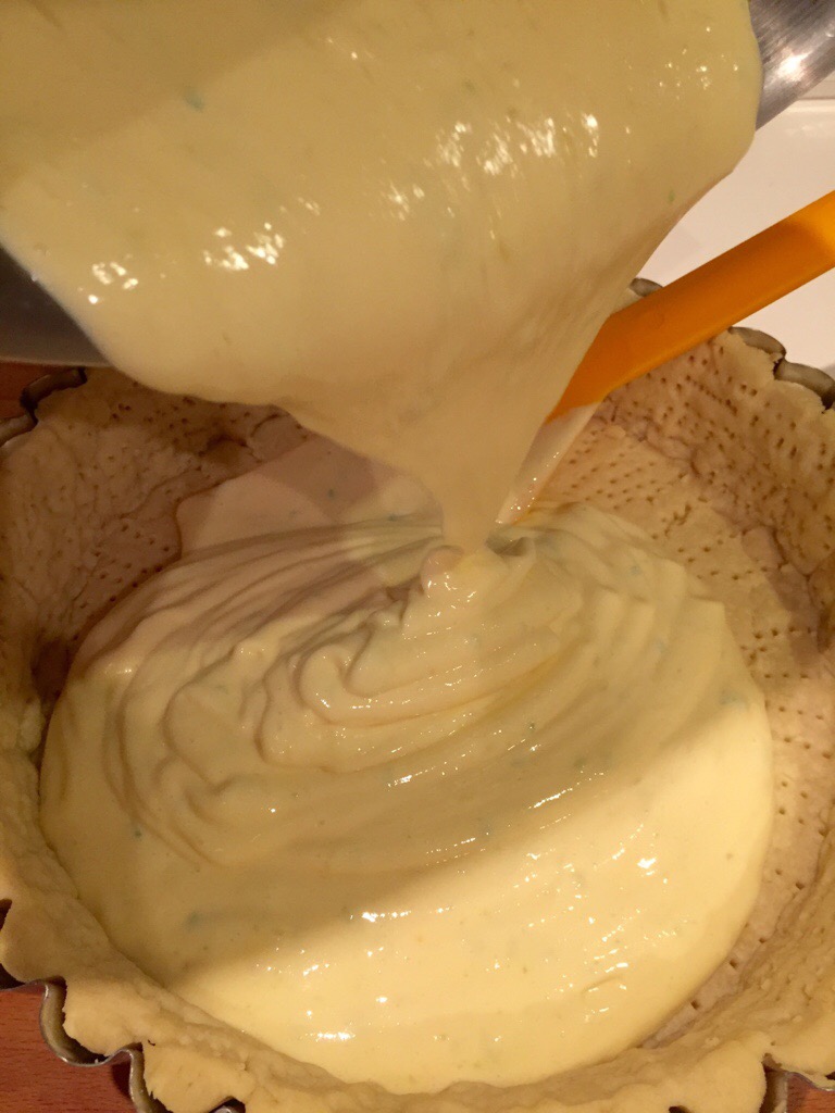 Beat in the sweetened condensed milk in a thin stream, followed by the lime juice and zest. Pour the lime filling into the warm pastry shell.