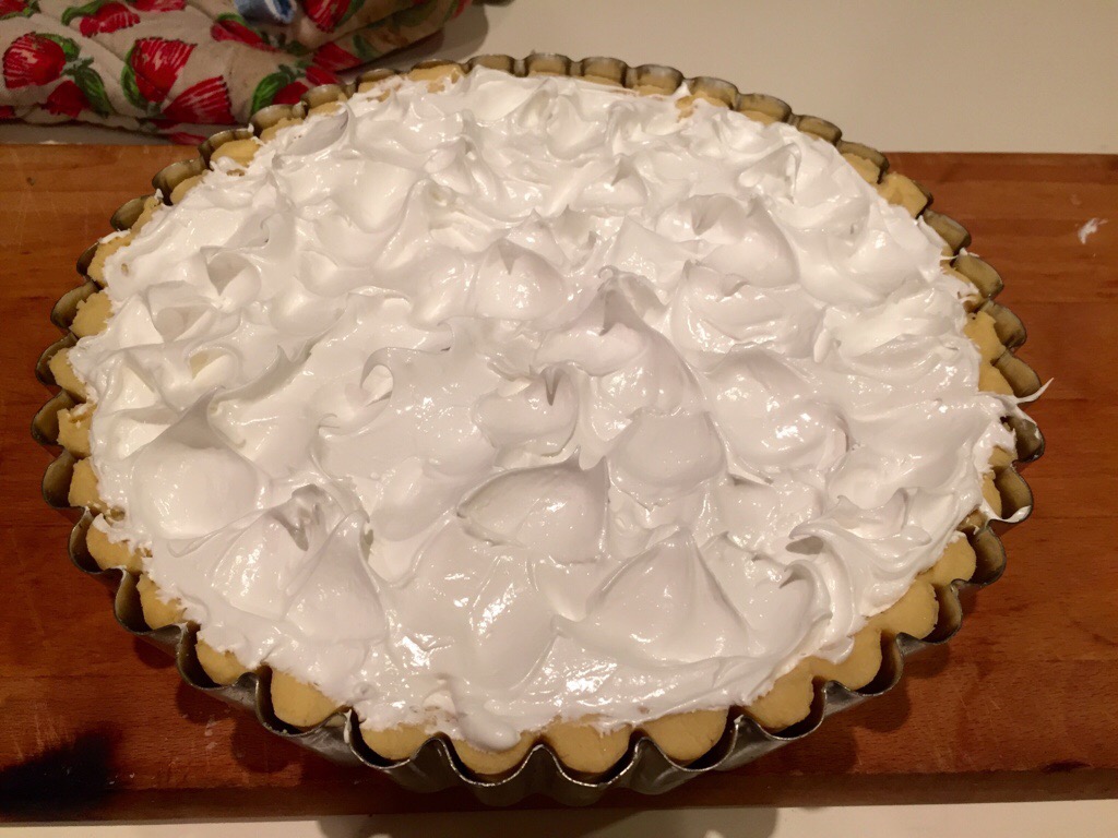 Carefully and sparingly spoon the meringue over the top of the pie, working with about a dessert spoonful of meringue at a time and starting at the edges of the pie, working your way in. There is only enough for a thin layer and the filling is quite soft so you have to be quite gentle as you spread the meringue out to cover the whole surface of the filling. I find it easiest to spread out the meringue and smooth the surface, then to rough the meringue back up into peaks with a teaspoon.