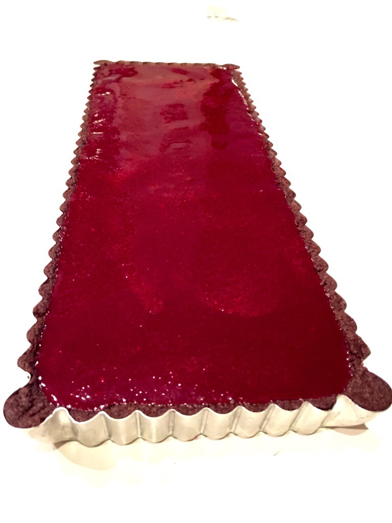So my last pie in July is a “Jelly Tip” inspired tart. It happened like this: I had some dark chocolate cookie dough in the freezer, left over from another project; and I had at the back of my mind an amazing Lindt recipe for a chocolate tart which I wanted to make again. Then there was all this talk about Jelly Tips on social media and I got to thinking…. you could so make a chocolate tart and do a raspberry jelly layer and a cream layer.
