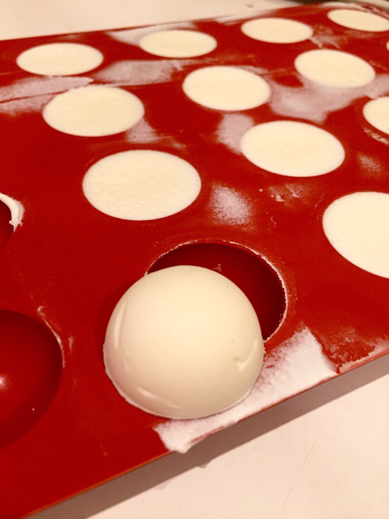 Whip the cream with the icing sugar until stiff peaks form. Spoon into 24 half sphere silicone moulds and level the tops with a palette knife. Freeze solid, at least two hours. Remove the half spheres from the moulds and return to the freezer.
