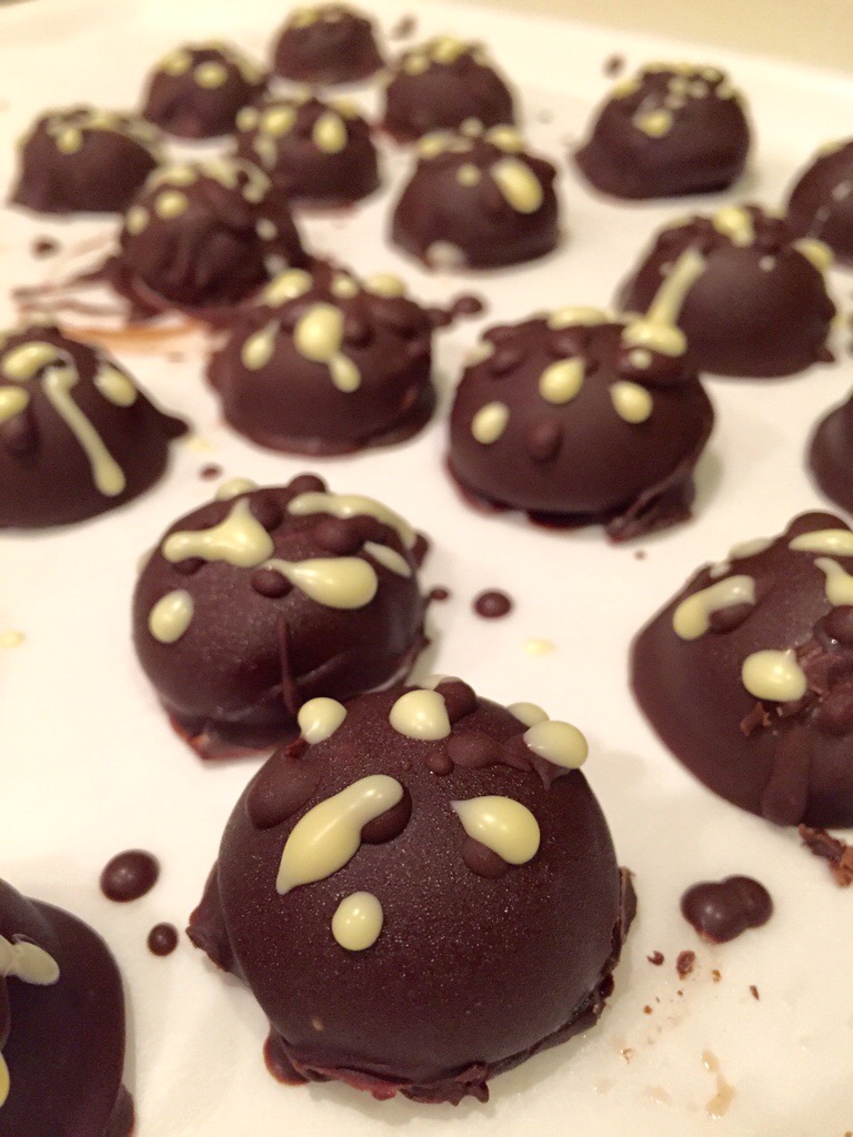 Working in batches of four, remove the half spheres from the freezer and dip each completely in the chocolate and sit on a sheet of baking paper to set. Try to completely cover the surface of the cream, as it will bleed as it melts if there are gaps. When the chocolate is part set, carefully run a skewer point around the base of the dome to neaten. When set, drip the domes with extra melted dark chocolate and melted white chocolate if desired. The bombs will set at room temperature, so you can use them the same day if you like, or re-freeze them to serve at a later date. Assuming you don’t sneak them into your mouth straight from the freezer.