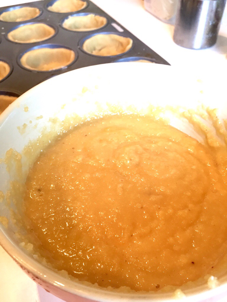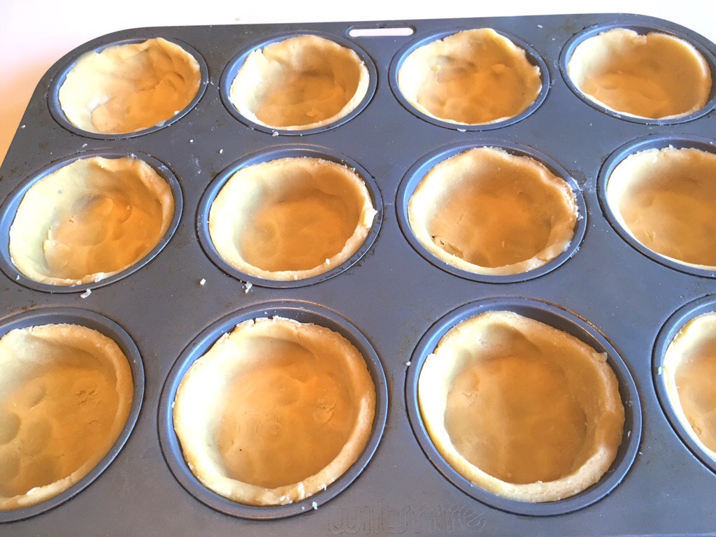 Roll out the pastry on a well floured surface to about 3mm thick. Cut 10 cm rounds of pastry. The first roll out will probably yield 9 rounds. Gather the off cuts back into a ball and roll out again to cut the remaining three rounds. Press the rounds into the holes of a standard 12 hole muffin pan. Don’t worry if the rounds crack, just mould the pastry back together with your fingertips. Set aside.