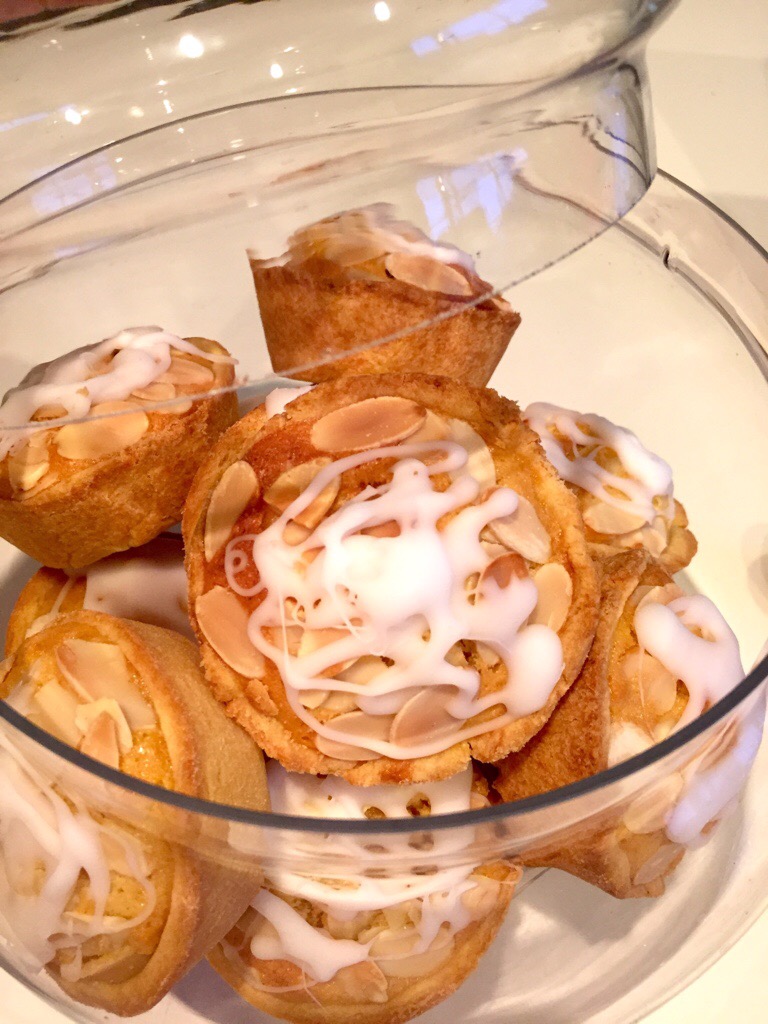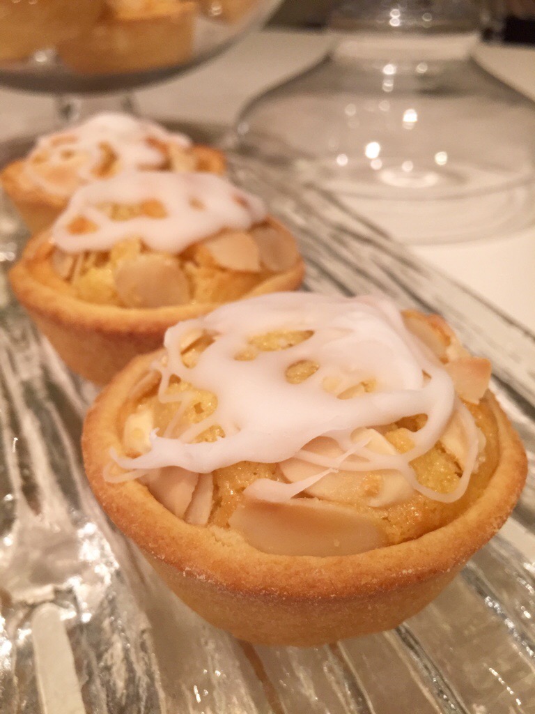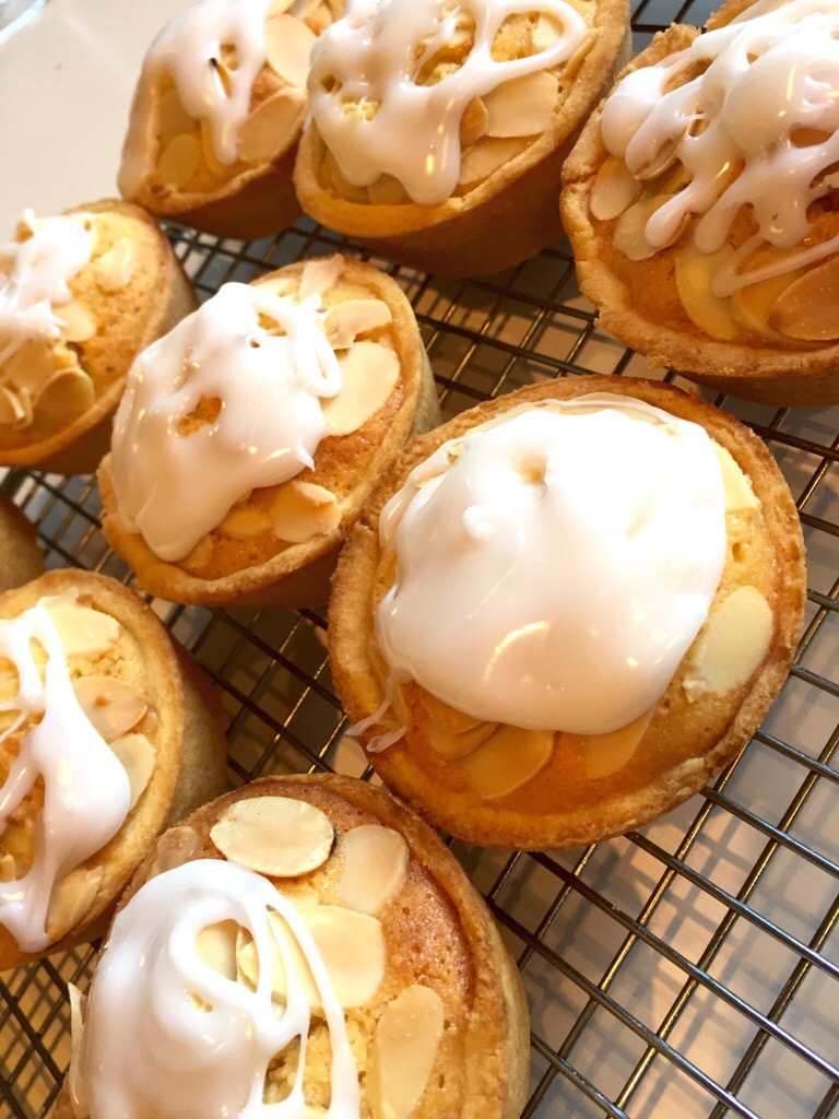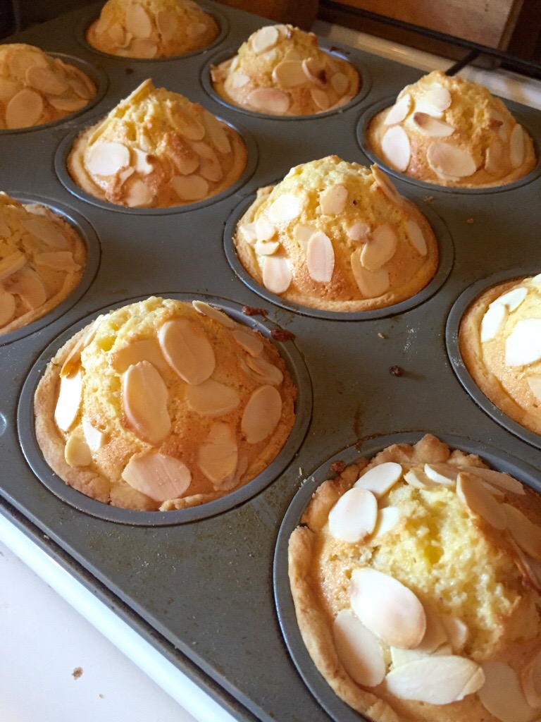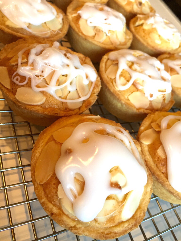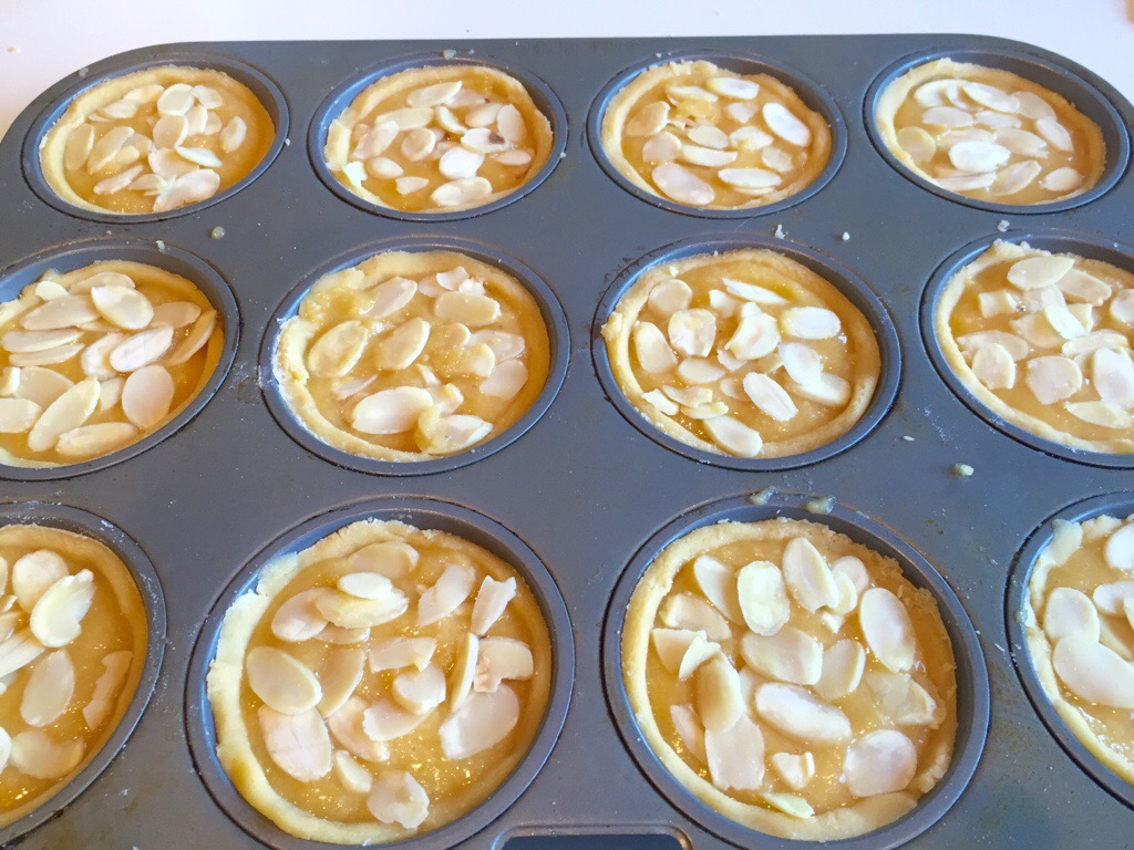 Bake the Mazarines at 175 degrees Celsius for 20 minutes. The tarts might peak up as the cook, if so, gently press them to a rounded surface while they are cooling. Remove the Mazarines from the muffin pan and cool on a wire rack.