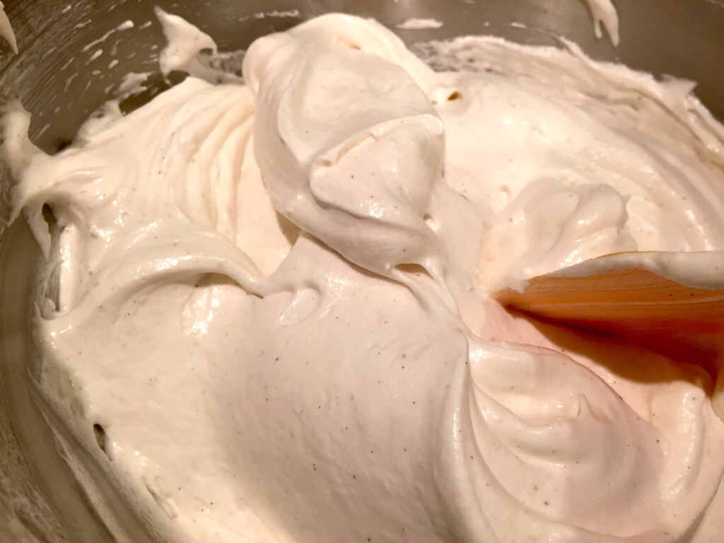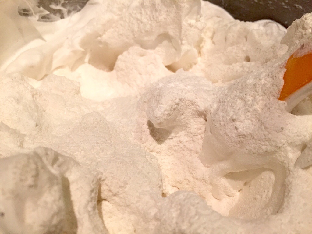 The finished meringueWorking with about 3 tbsp of the flour mixture at a time, sprinkle over the meringue and then, using a spatula, make cutting and folding movements through the mixture until all the flour mixture has disappeared. Continue until all the flour has been incorporated. Make sure that you scoop all the meringue from the bottom of the bowl during the folding process to make sure your mixture is as homogenous as possible. Adding the flour will collapse the meringue a bit – this is normal!