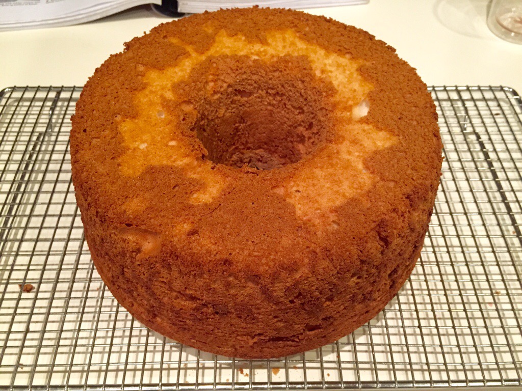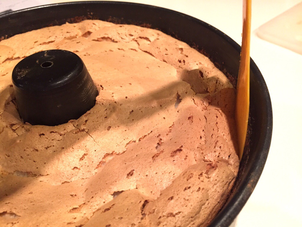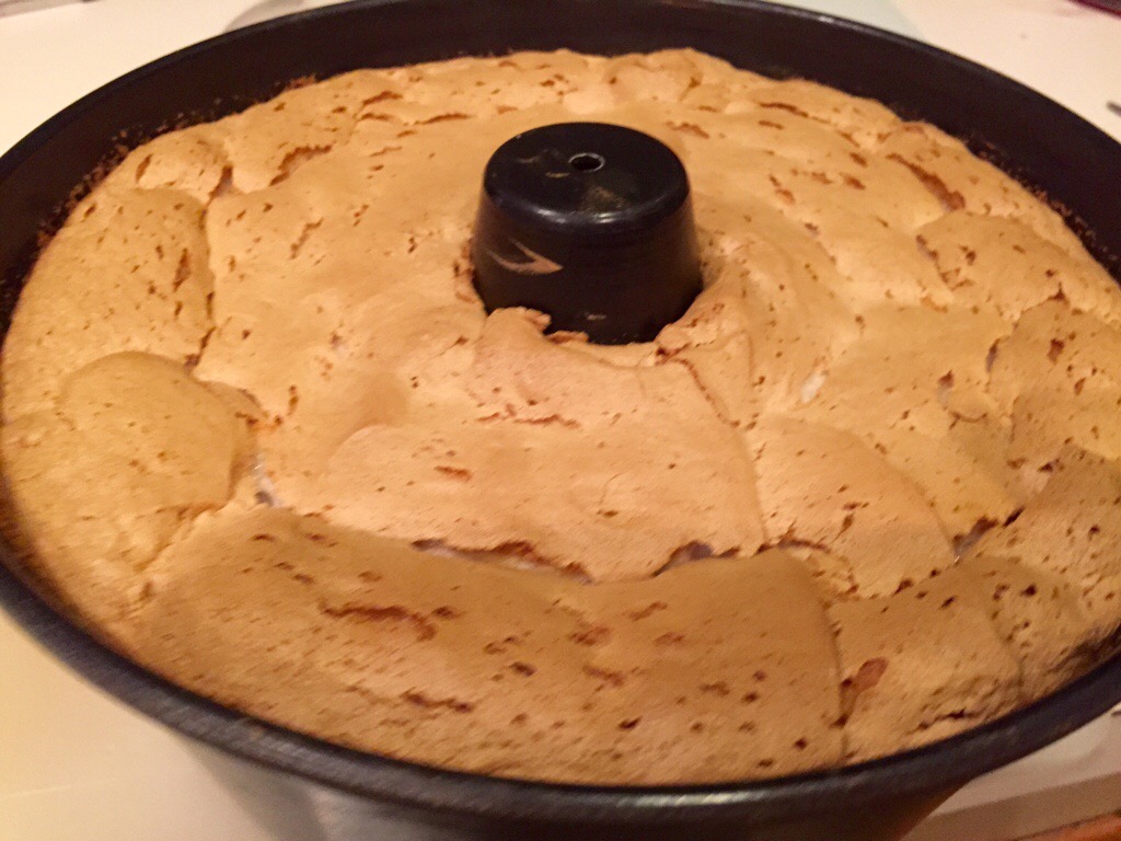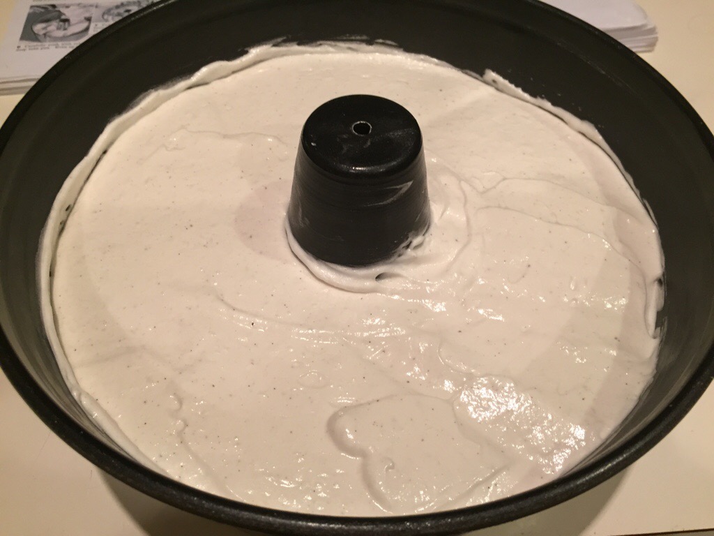 The cake ready for bakingBake the cake at 175 degrees for 45 minutes, or until the cake springs back when lightly pressed. Remove from the oven and immediately invert the cake so that it “hangs” in the tin. This helps the cake stay lofty as it cools. It’s important to do this step. Let the cake cool completely in the tin. When the cake is cold, run a thin spatula all the way around the outside of the cake and around the inner tube part of the cake. Invert the pan again and give the pan several sharp taps. This is a nerve racking process, but the cake will, after a few shakes, come completely away from the inside of the pan. It’s normal for the pan to have a thin layer of cake crumbs still attached after the cake has come free.