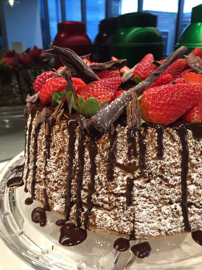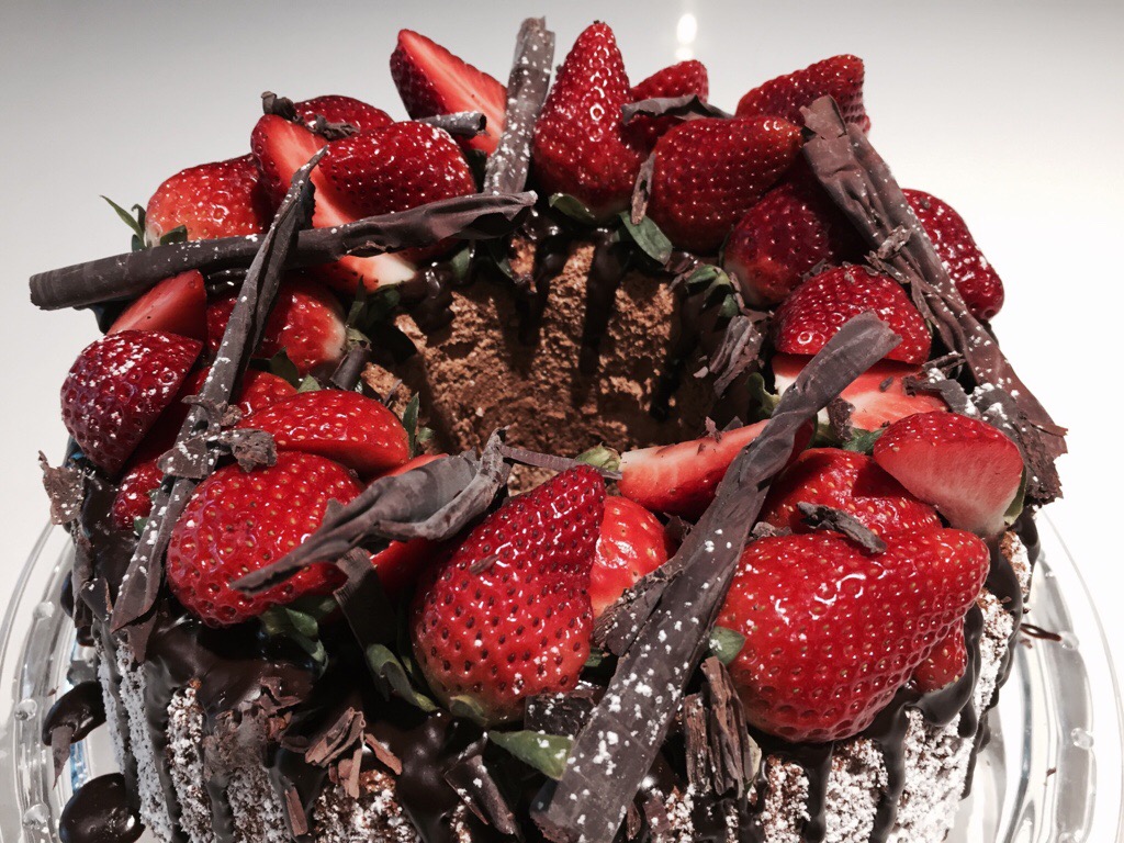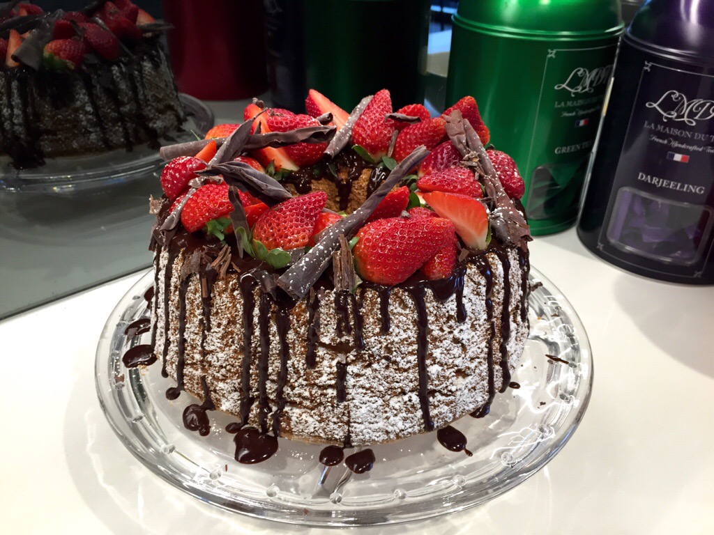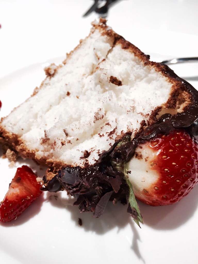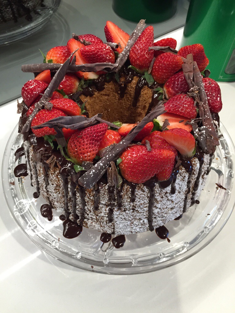 The finished cake!Decorate your angel food cake as desired – I like the rustic fruit look! To get this look, dust the sides of the cake liberally with icing sugar. Place on a serving plate, then drizzle with warm chocolate ganache (I did this by having the ganache in a ziplock bag, then snipping a corner of the bag and piping the ganache out). Top with cut strawberries and chocolate curls, then sprinkle very lightly with more icing sugar.