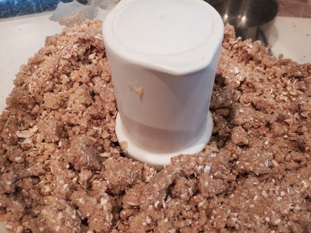 Process all ingredients except the chocolate until the mixture resembles crumbs. Press all but 1 3/4 cups of the mixture firmly and evenly into the prepared pan. Set the reserved mixture aside for the topping.