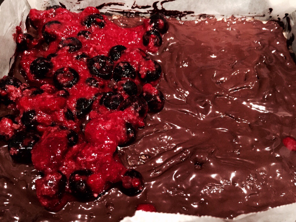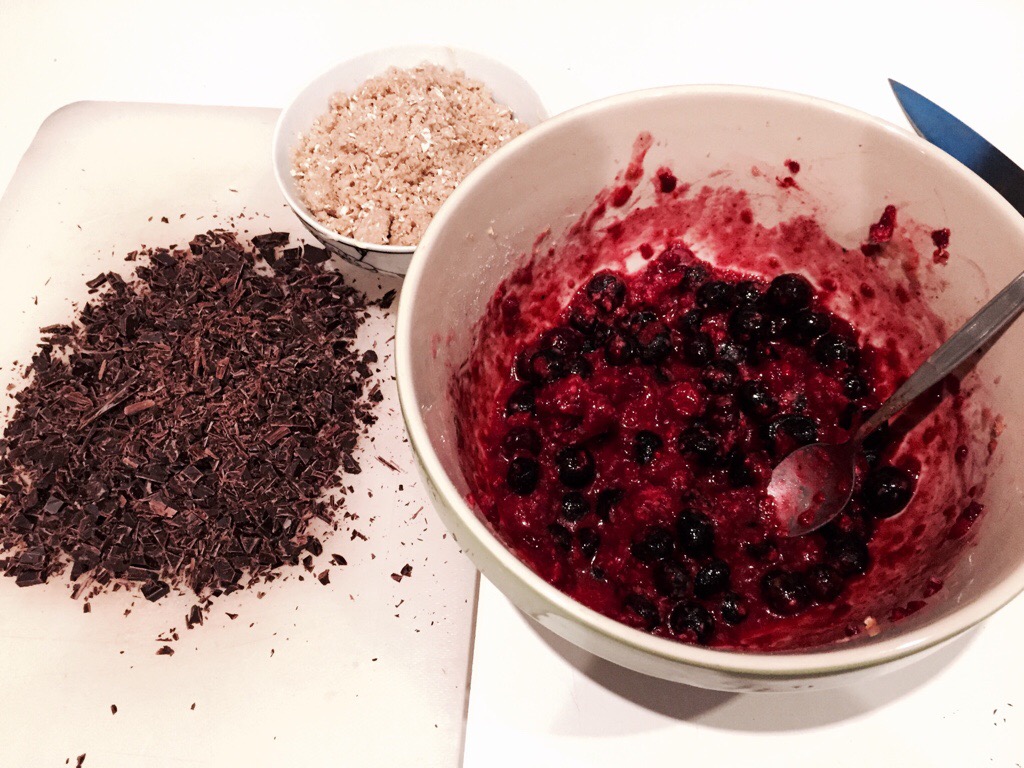 However, I still wanted to make them, and adding the layer of chocolate that I had always believed was present to the version I made was going to be pretty simple. They are just finishing their time in the oven now, and smell unbelievably good. I didn’t make them all raspberry due to a supplies failure in my freezer, so I had to do half blueberry half raspberry instead. I figured: its pretty hard to go wrong with ingredients like these: