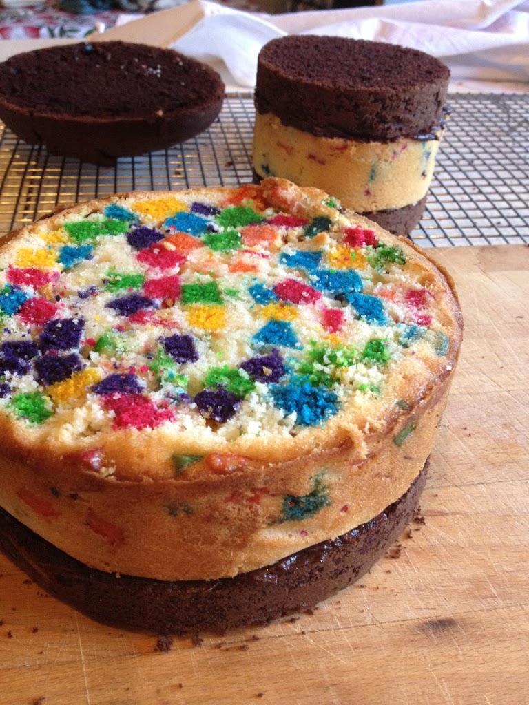 I confess that I have dropped them off at work now without having taken a picture of the pawprints. I’ll have to update the post later with that version, but in the meantime, here is how to have a rainbow sprinkle overload. These cupcakes have kid’s birthday party written all over them! They remind me of a petite version of my Confetti Cake, below.