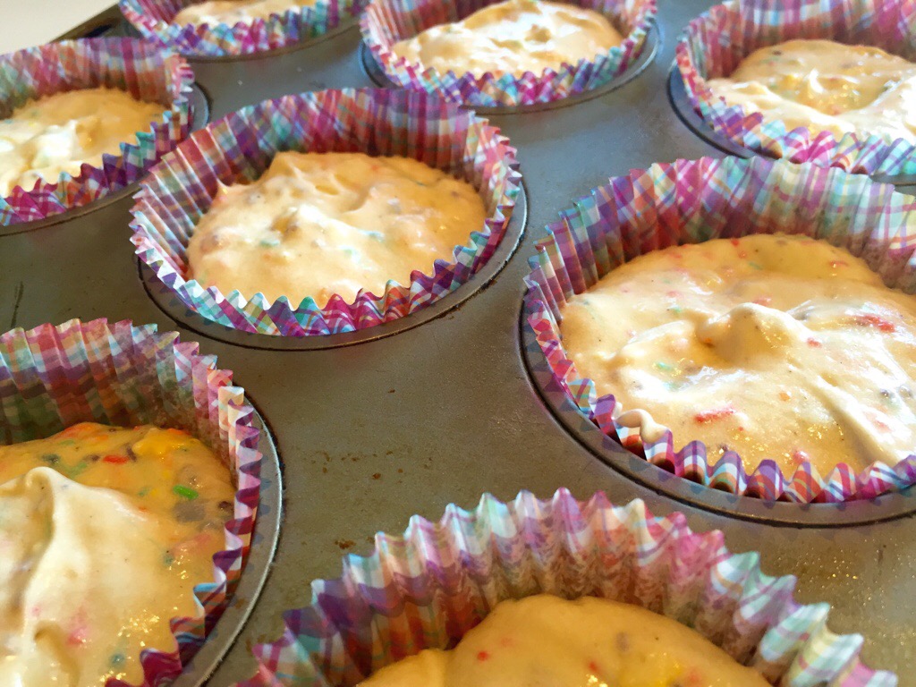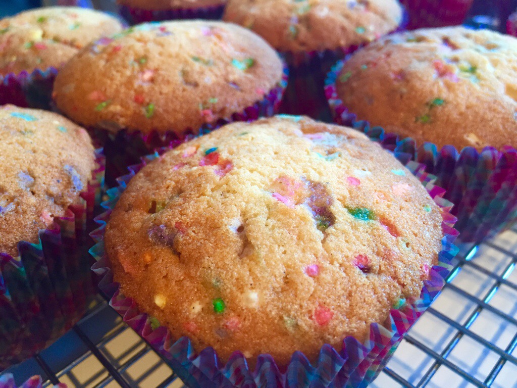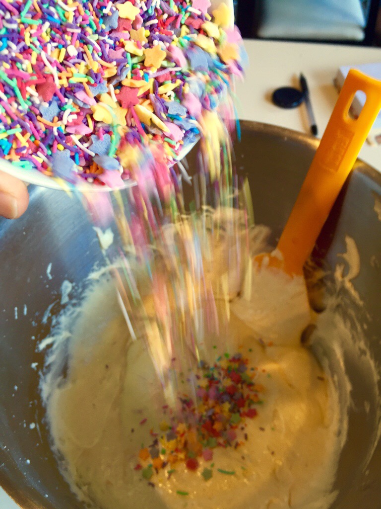 Another Pinterest inspiration has been done! It’s most commonly known as “Funfetti” cake/cupcake/pancake (eek!) – I don’t know why, and I don’t really love the name, these baking creations are chockers with sprinkles, or hundreds and thousands, and are really really cute!