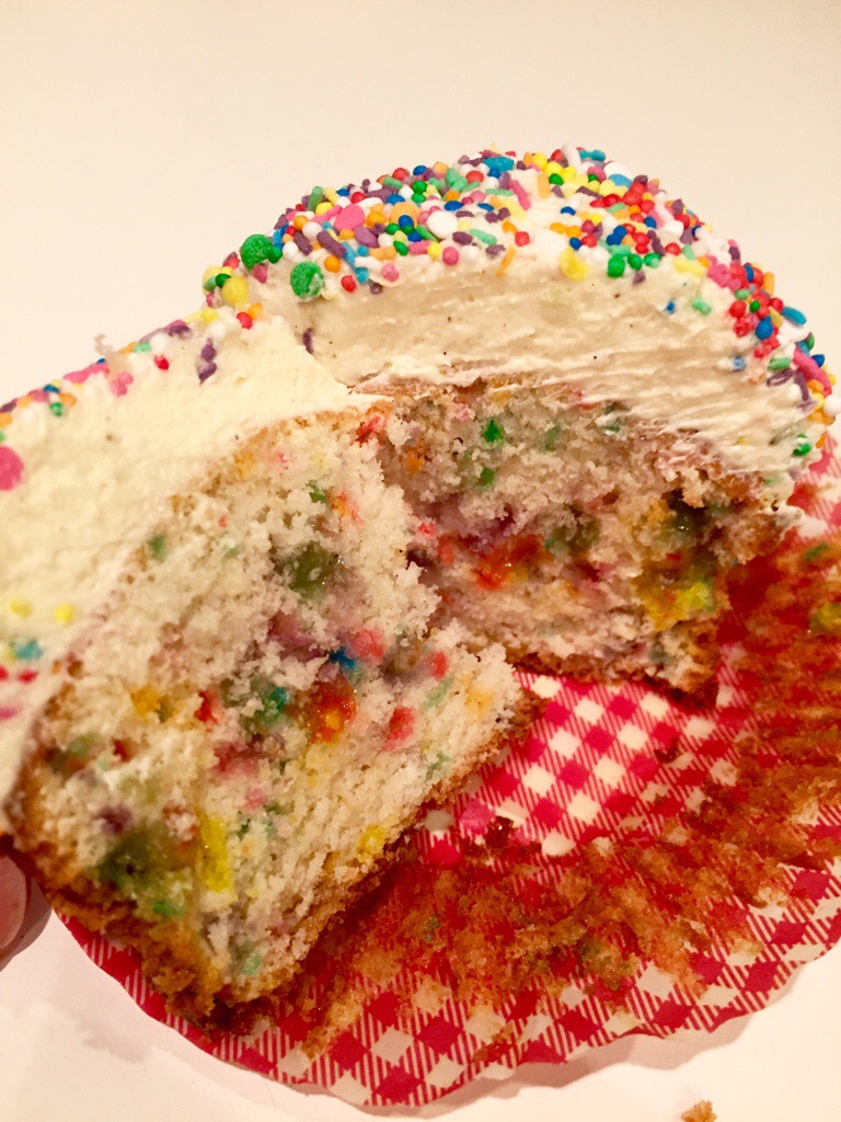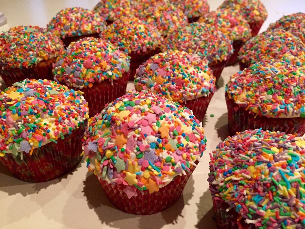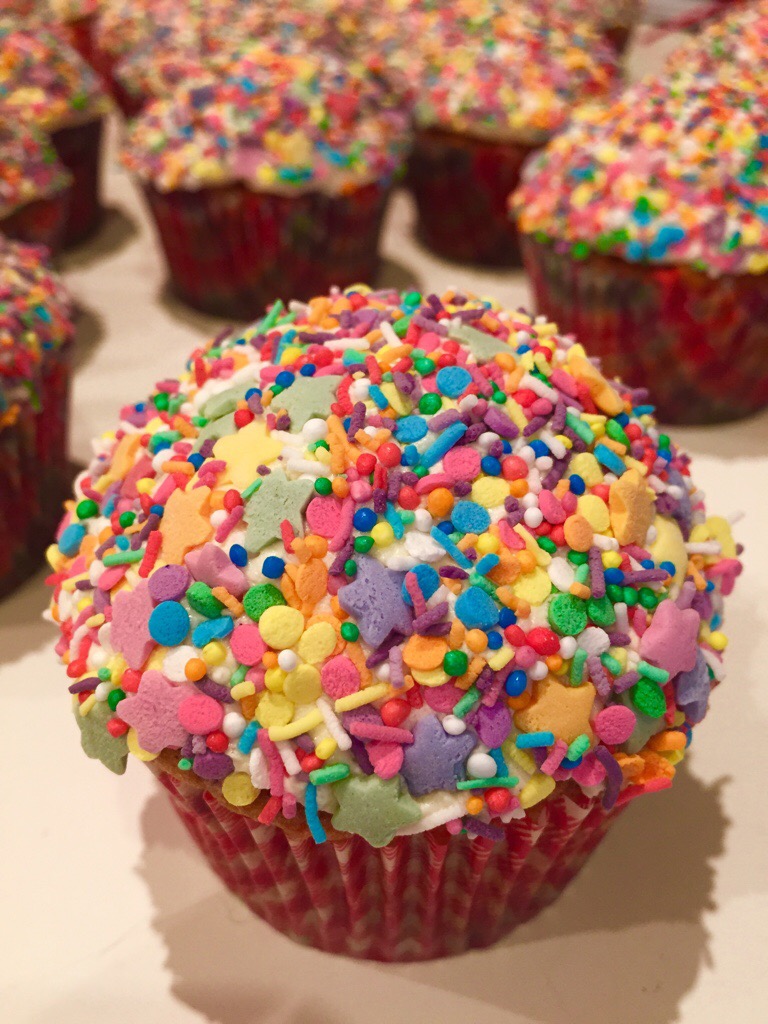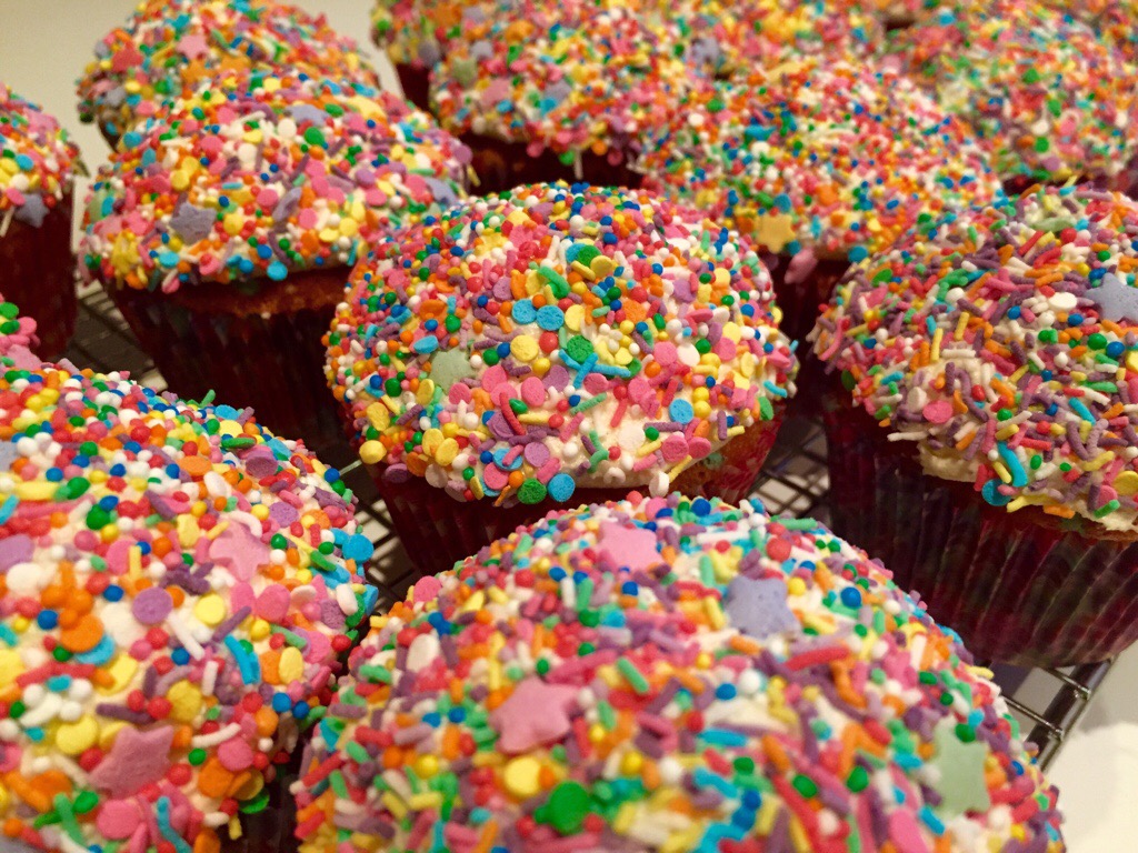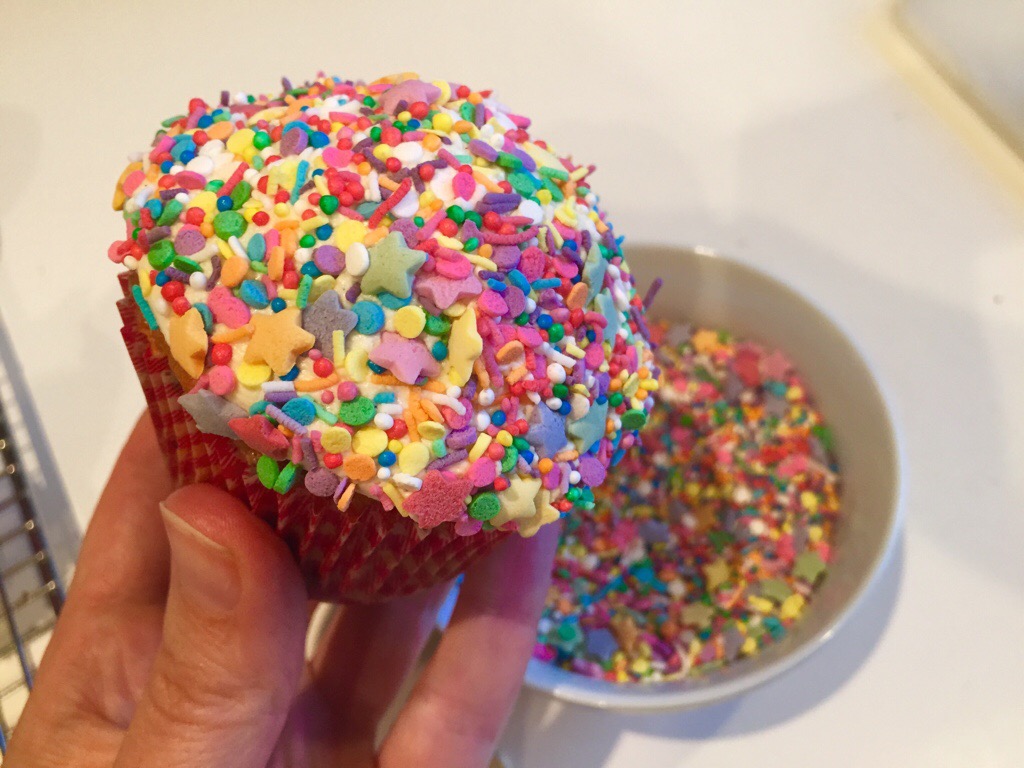 The base is a egg white only cake, to make the best contrast with the coloured sprinkles, which aren’t just on the outside of the cupcakes, they are inside too!
