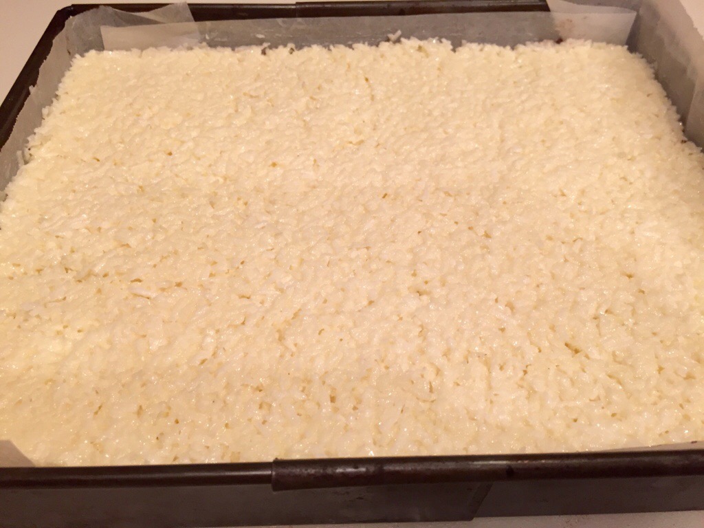 Bake for 20 minutes at 175 degrees Celsius, or until just set in the centre. The brownie will still “whisper” quite a lot. Let the brownie cool until it starts to firm up (it need not be completely cold). Top with spoonfuls of the Coconut Bounty Bar Filling; press down and smooth the top.