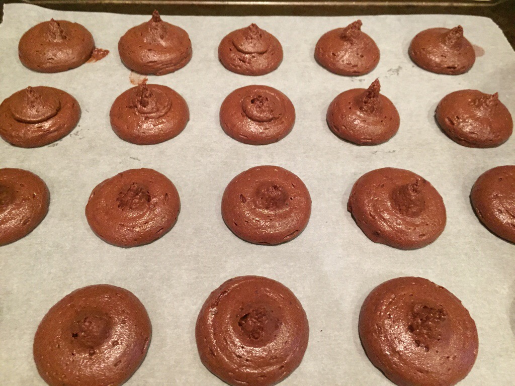 Pipe 4cm rounds of the mixture onto a baking sheet lined with bake paper, leaving at least 3cm between each “cookie” for spreading. You will need to do two baking sheets of approximately 20-22 “cookies” each.