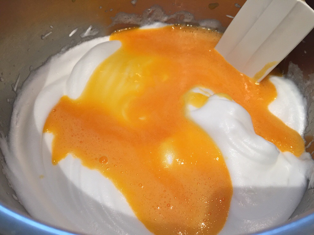 Remove 1 tbsp of the caster sugar from the 50g amount. Whip the egg whites and the bulk of the caster sugar until stiff peaks form. Whip the egg yolks and the remaining caster sugar until just foamy. Fold the egg yolk mixture into the egg white mixture. Fold in the combined flours (and cocoa if using).