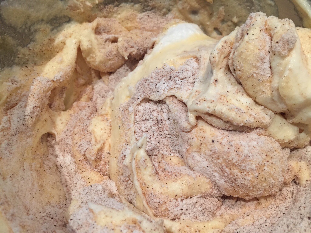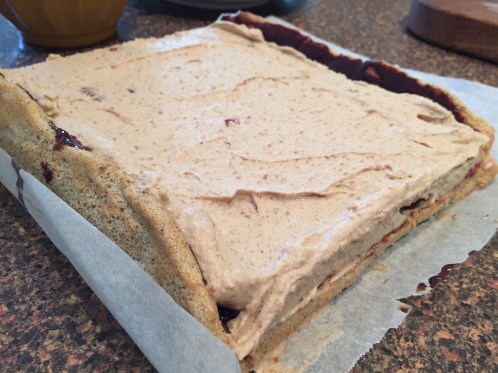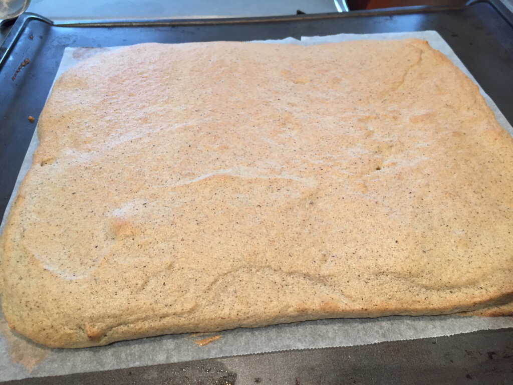 Another thing I tried is to put a pattern on the exterior of the sponge. This is done by applying a pattern in a coloured mixture to the sheet upon which you will bake the sponge for the roulade. You then cover the pattern with the regular mixture. It’s usually done with a stencil, which I didn’t have, so I tried to make do.A few confessions. I did this without reference to my patisserie book in which I had read the technique but never tried it. Also, I did this with a piping bag, rather than a scrapy stencil. Finally, I got all gung-ho and “she’ll be right” and didn’t have the patience to let the pattern freeze before I put on the rest of the sponge mixture. Then I forgot to drop the tray a couple of times onto the bench to encourage any air bubbles escape the mixture. All this led to things being a little less than beautiful. I also learned that the pattern has to be quite all-over to be seen in a roll!