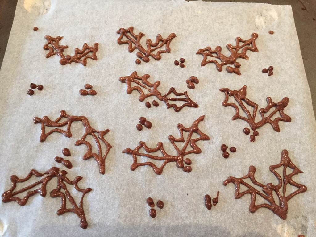 Here’s what I did. I mixed a little cocoa into a small portion of the chestnut sponge mixture. Then I piped holly patterns on the sheet of paper that I had prepared for the sponge roll. Then I was meant to freeze the pattern but didn’t. Then, I carefully spread the chestnut sponge over the pattern. Then I baked it.