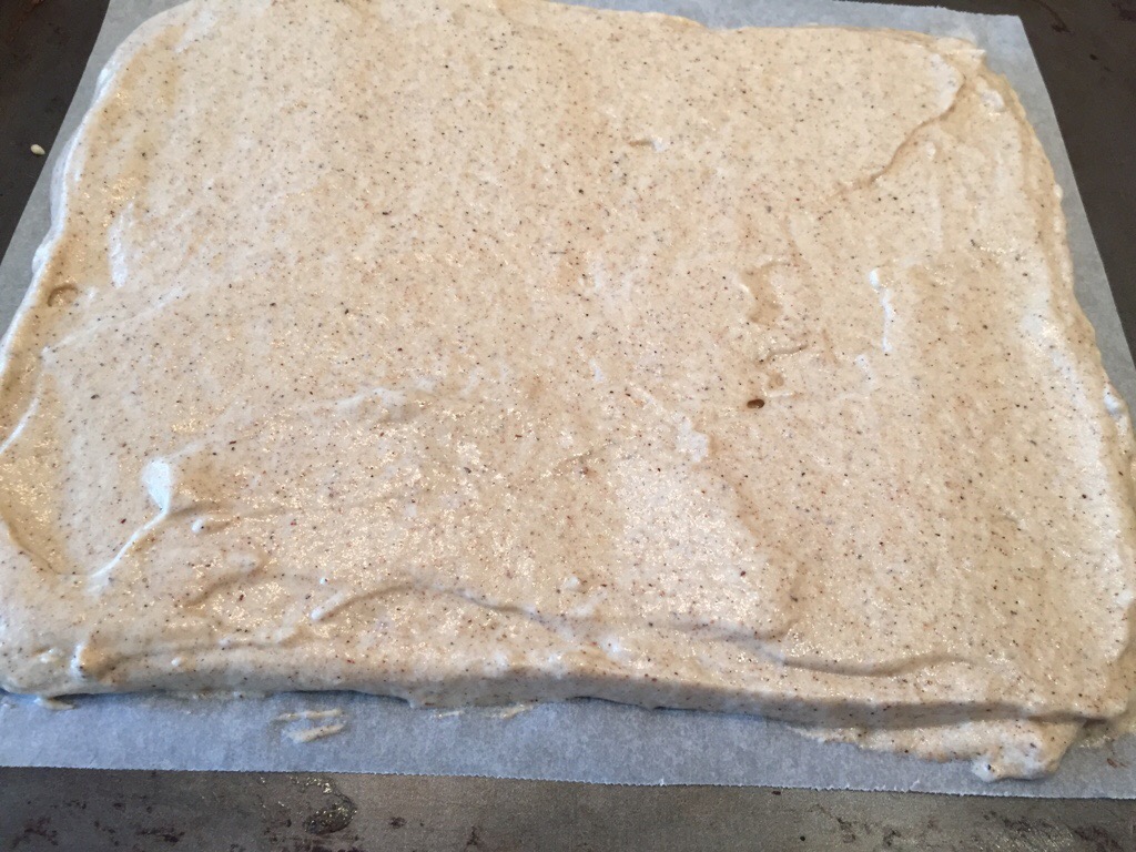 If you want to try a patterned roulade, combine 1/2 cup of the mixture with the optional cocoa, mixing until smooth. The sponge mixture will deflate, but don’t worry about that. Pipe patterns (such as wavy stripes) over the marked rectangle on the bake paper, then freeze the tray until the piping is solid.