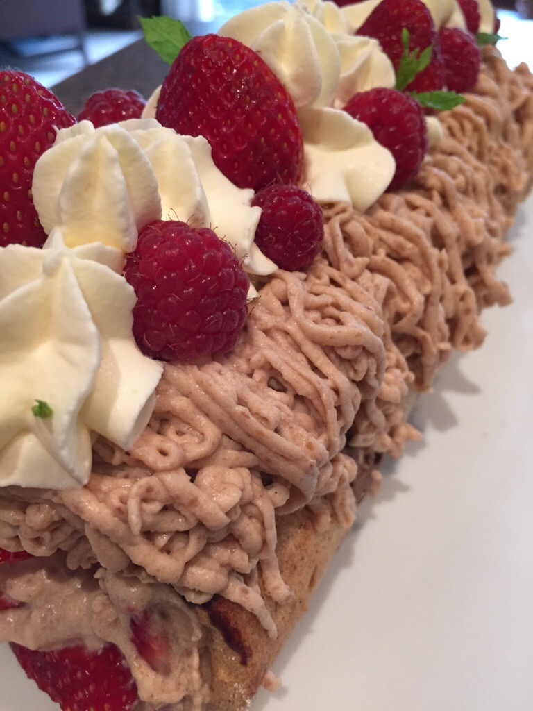 Unroll the cooled Chestnut Sponge and peel off the paper. On the “inside” of the roll (the side with the concave curve), spread the ganache in an even layer. Lay the strawberries evenly over the ganache, then spread with the Mont Blanc Mousse to about 1cm thick, Don’t try to spread the mousse right to the most curved part of the roll, there won’t be room for it when it is rolled up.