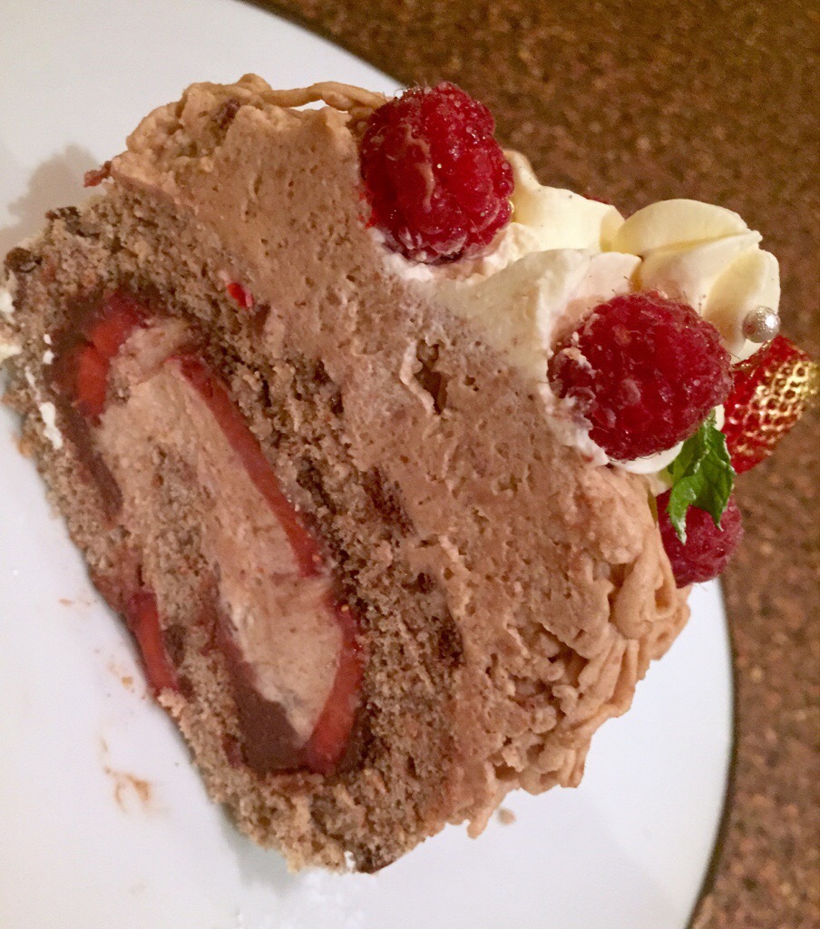 The roulade is filled with a lick of chocolate ganache, sliced strawberries and the Mont Blanc chestnut mousse, and my only grumble with this is it makes the whole thing a bit beige. Whipped cream inside would be prettier. Mont Blanc mousse is so much tastier! Also, unless you can get a small tin of chestnut puree (or get whole chestnuts of your own to puree) you are going to have a lot of mousse. It’s a slight dilemma.