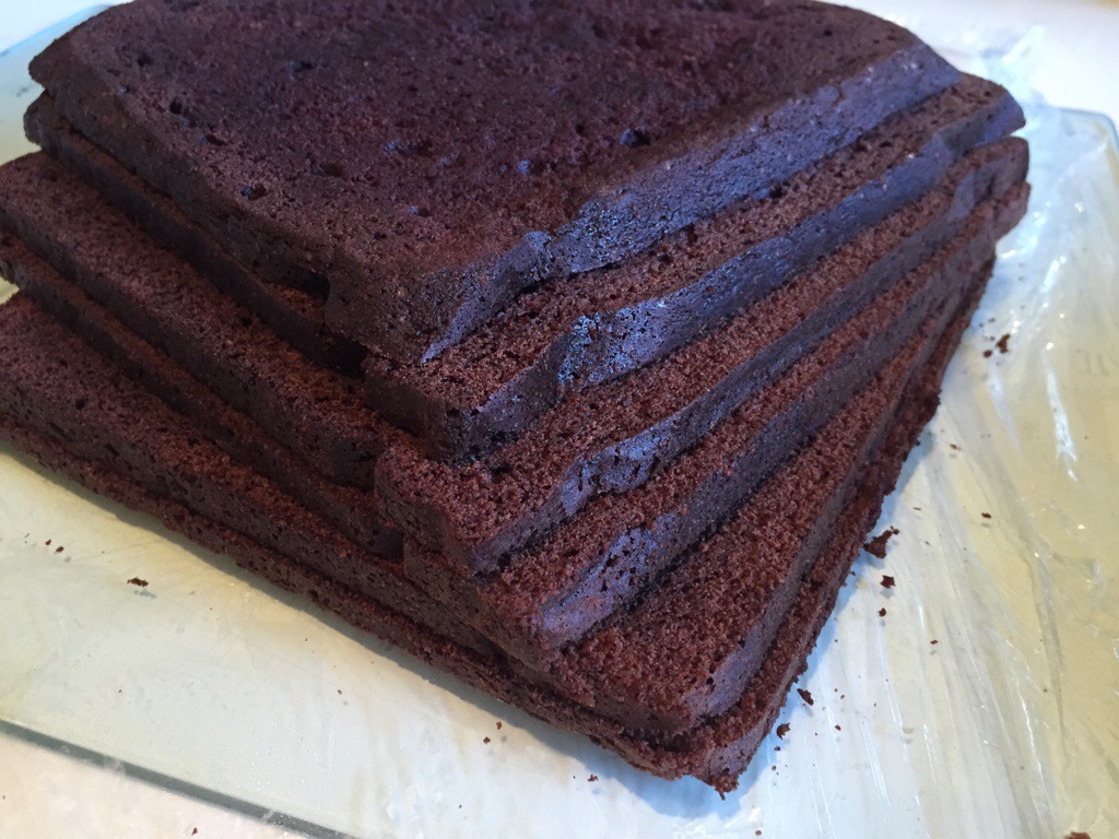 Place all ingredients except for eggs in a large bowl. Beat until smooth. Add eggs and beat on high for two minutes until light and creamy. Spoon the mixture into the prepared pan and level the batter. Bake at 160 degrees Celsius for about 1 hour 5 minutes or until the cake is firm to the touch. Let cool, then wrap and refrigerate overnight – this makes the cake easier to cut! Trim the top of the cake so that it is flat (if there is a bit of rounding on the edges of the top layer that is OK, you are going to trim the sides anyway, then carefully split the cake into three even layers, then split each layer into two. The layers should be about 6-8 mm thick.