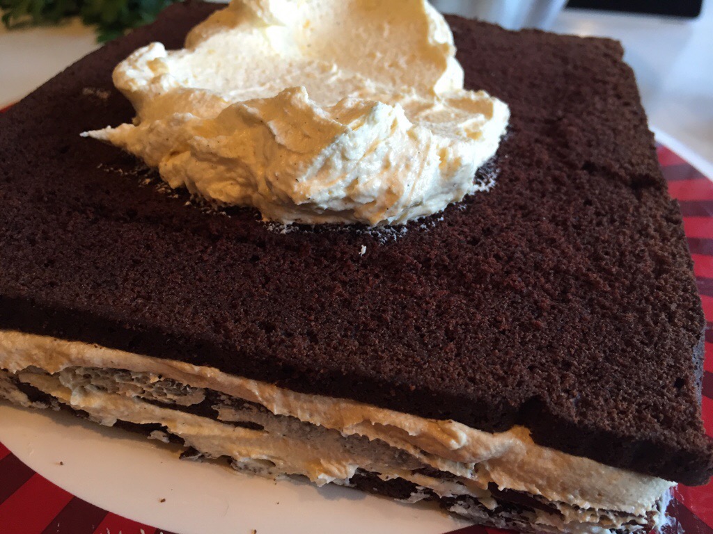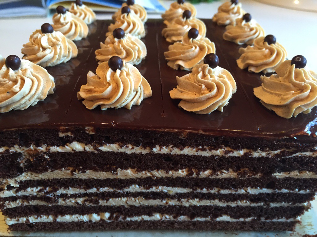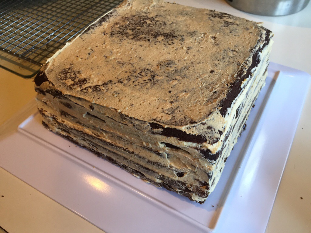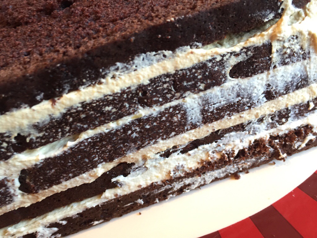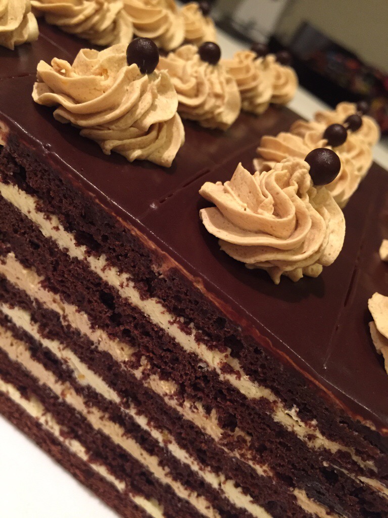 It was my actual real and scheduled turn to make morning tea at work this week and to commemorate this special occasion, I wanted to do one of these coffee oriented cakes. I confess I actually wanted to make Opera Gateau, which is a well known French patisserie item which appears to be having a bit of a renaissance right now. However, I had a head cold and was feeling too poorly to commit to the real, intense patissier madness that is Opera Gateau (for example you have to bake many individual layers of cake – and went for a sort of halfway house – a single deep chocolate cake, split into 6 layers, filled alternately with “cheat’s” mousseline buttercream (more on that later) flavoured heavily with coffee and vanilla, then drowned in chocolate ganache.