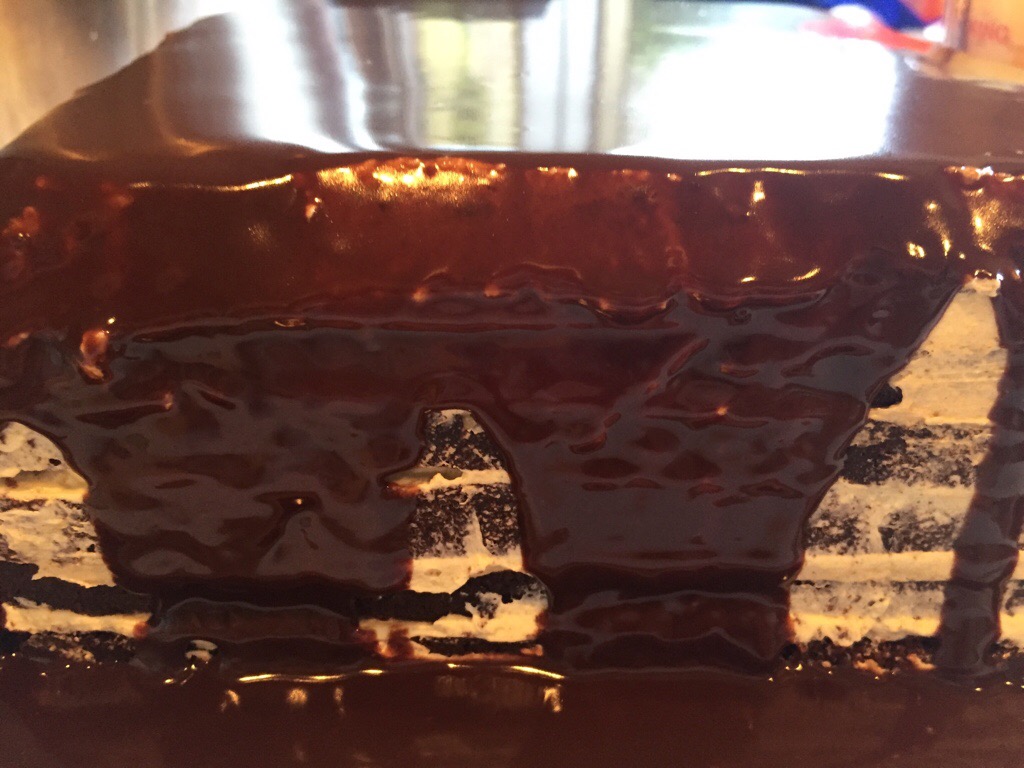 Ensure the ganache is at room temperature but still of a pouring consistency similar to liquid honey. Transfer the cake to a wire rack positioned over a deep plate (I didn’t do this because my brain was on the fritz and it was messy!) Pour all of the ganache, all at once, on top of the cake and let it dribble down the sides of the cake. You shouldn’t need to touch the ganache at all for it to cover the entire surface of the cake. Let the cake drip for a while, then transfer the cake to the refrigerator to set.