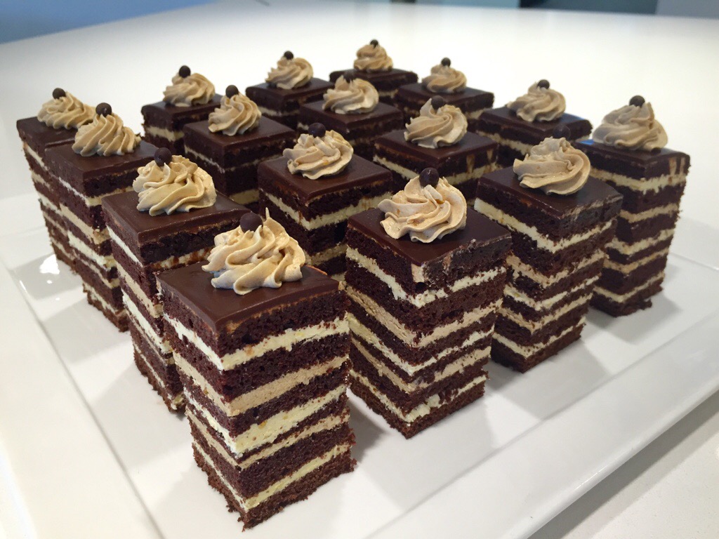 When the ganache is set (after at least half an hour -test this by touching the sides of the cake, not the top – you will leave fingerprints!) remove the cake from the fridge and transfer to a flat surface to trim the edges. Using a large knife, trim about 8mm-1cm from each side of the cake so that you have beautiful smooth sides with the mousseline layers clearly exposed. The cake should still be square. Using the blade of the knife and just touching the surface of the ganache, gently mark the cake into 16 equal portions (mark the halfway point first, then mark each half into half – or use a ruler if your “eye” is no good at this!).