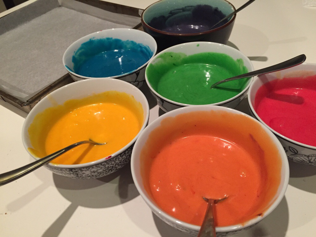 red, blue, yellow, green, orange, purple food colouring (or at least red blue and yellow, you can mix these for the secondary colours) gel colouring is best but liquid colour will work too. I used Wilton colours.